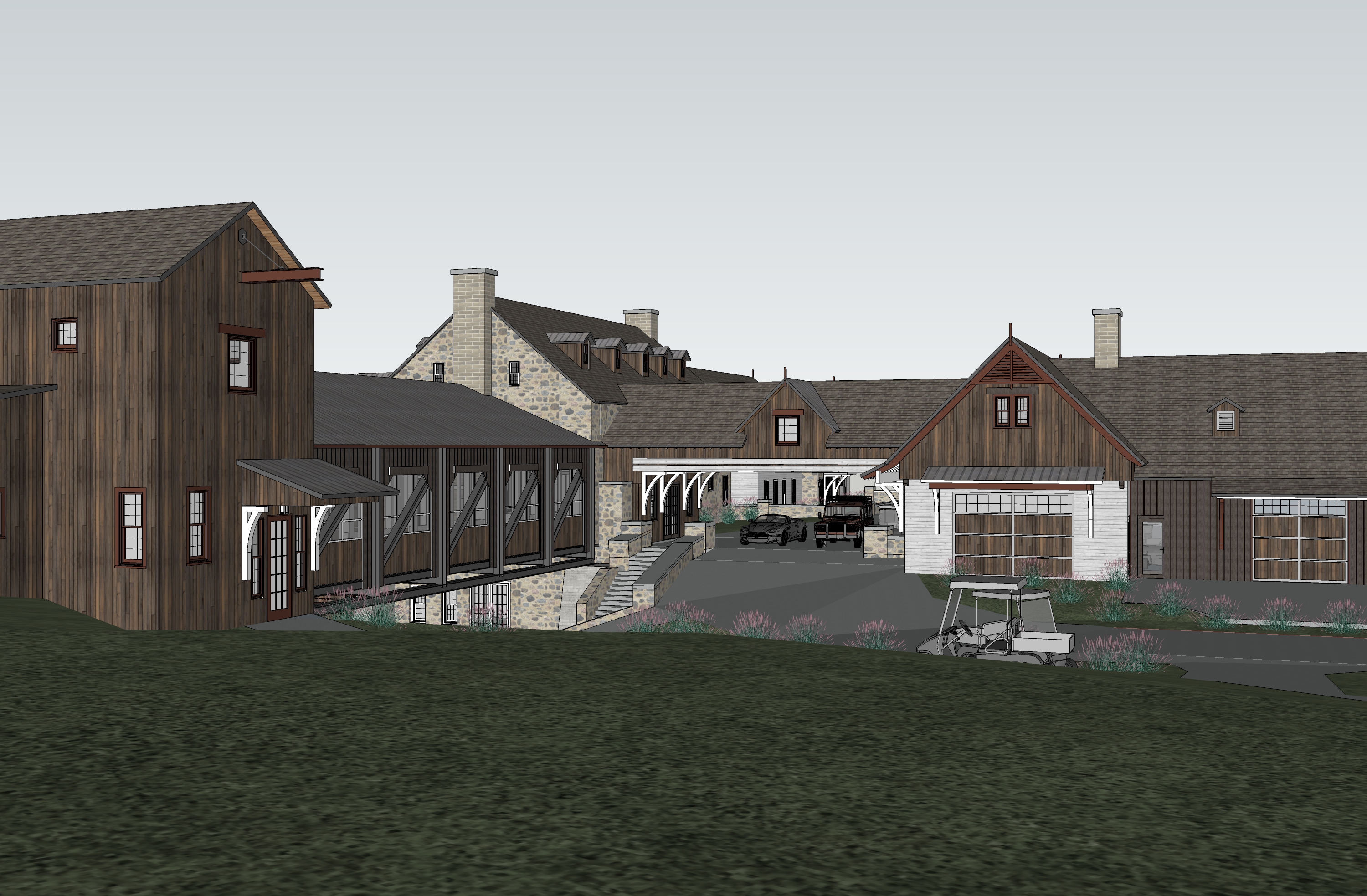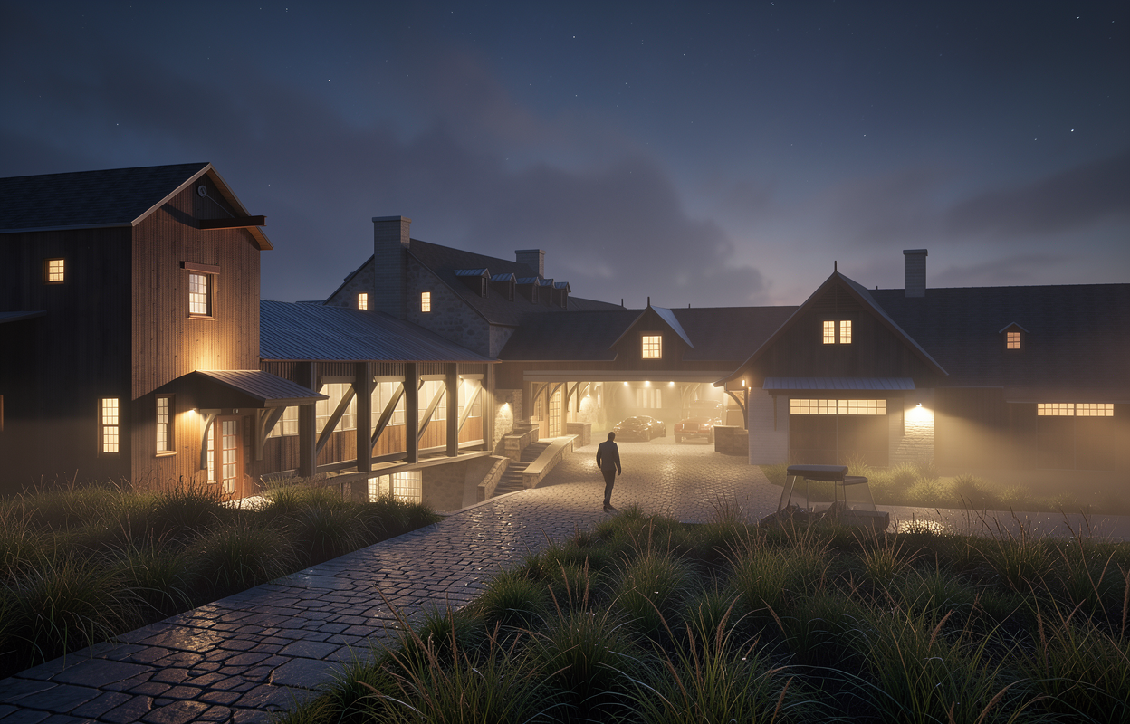 industrial design paver drive under cover tall grass with single person walking on stone path night fall sunlight on building face fog soft interior lighting
