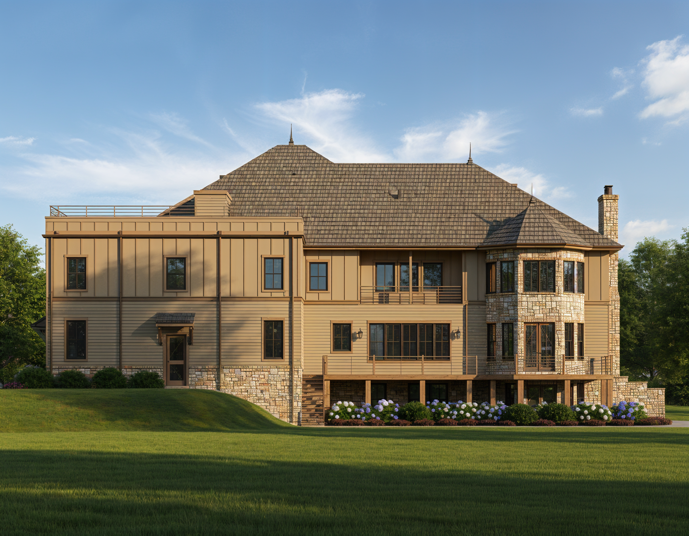 the stone and brick will be a white wash look the roof shingles and windows will be black the tan lap siding and board and batten will be white the deck and railings will be black the door to the left will be black the second floor railings will be black