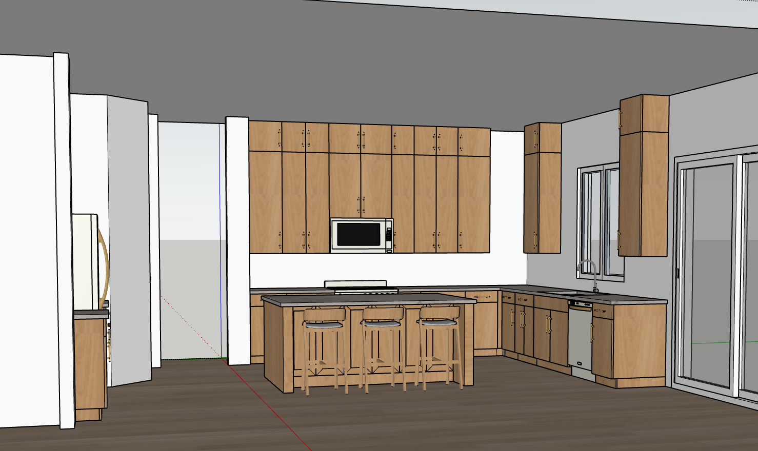 this is a gorgeous modern kitchen with slab door and drawer front cabinets made of white oak and stained with a mirage stain the upper cabinets go all the way to the ceiling all the handles are bronzed gold the countertops and back splash are made of a beautiful taj mahal quartzite lookalike quartz warm white cream with gold and gray veining the flooring is a beautiful hardwood that compliments the white oak cabinets the kitchen is overall warm modern and comfortable without being too busy the appliances are white with bronzed gold handles and hardware lots of natural light is coming in through the window over the sink and the sliding glass patio door on the right side of the image