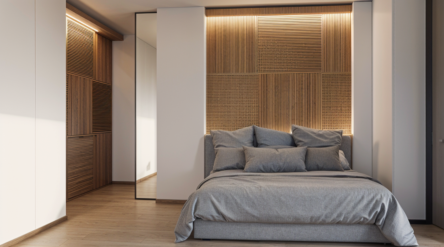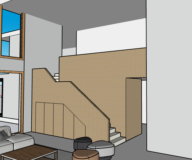 create a modern minimalist interior living space with a sophisticated and tranquil atmosphere the highlight is a staircase with a warm light oak wood finish complemented by walls in a soft dove white use large windows to bring in natural daylight and add a touch of sky blue to capture the serene sky outside create a cozy seating area with plush sofas in light taupe paired with round comfortable poufs in soft gray and warm earth tones incorporate a sleek coffee table with a walnut brown top design the space with a calm and inviting ambiance perfect for relaxation use a porcelanic warn light grey flooring mate finish the staircase steps should be similar to the flooring material respect the entrance to the top floor dont close the staircase respect the geometry 100