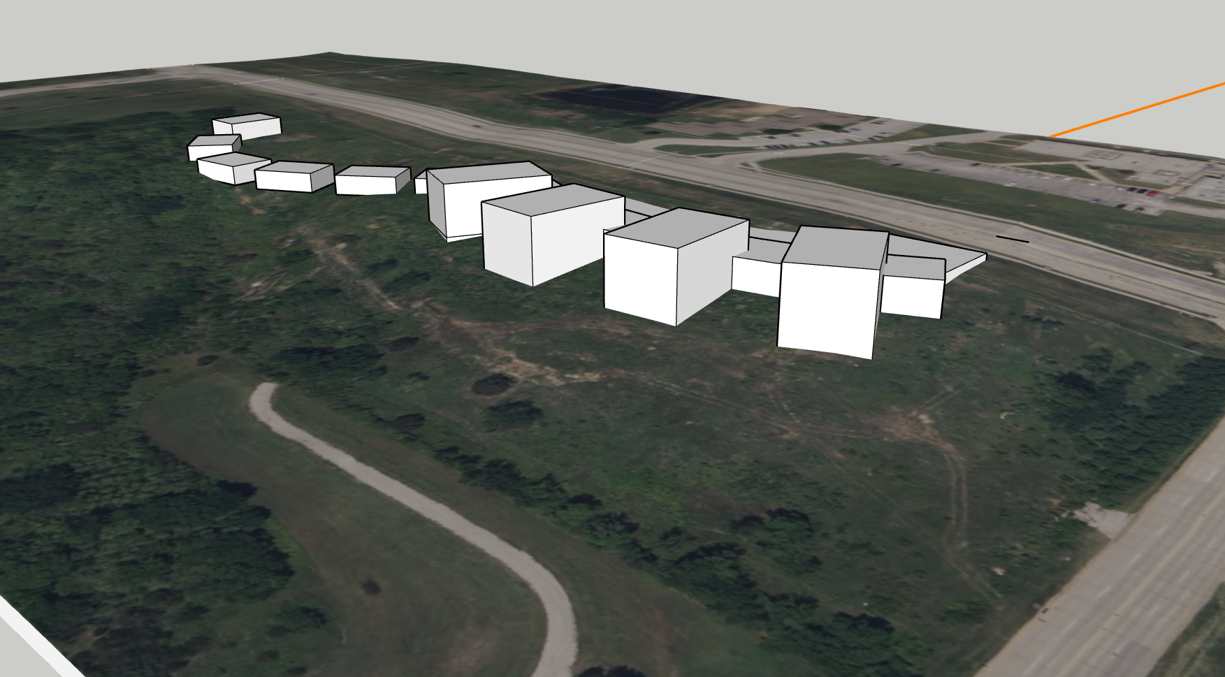 multifamily building on sloping wooded site with lake below with main road on north and east side