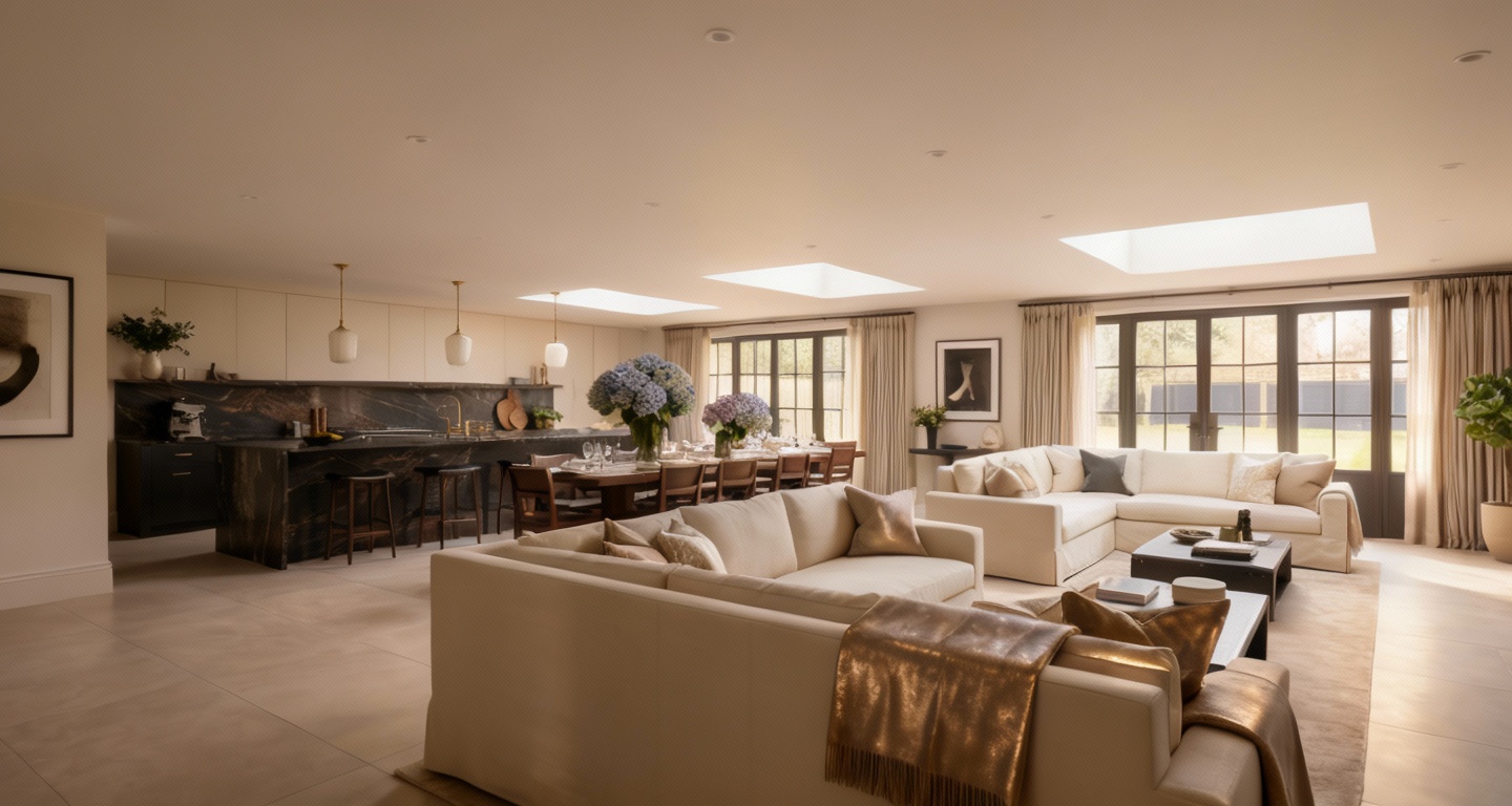 the scene features a long l shaped front counter with light blue mosaic tile cladding on the customer side and a smooth white quartz countertop the corner walls are a smooth light grey pebble stone tile on top of the counter is a clear glass sneeze guard with metal standoffs behind the counter are menu boards mounted high on the wall with a greek theme branding go greek with blue backlighting and light wood wall cabinets on both sides of the menus floor is a gray polished concrete ceiling is a clean flat ceiling with several recessed downlights walls are light neutral slightly textured warm neutral commercial lighting soft shadows realistic reflections on glass and quartz make lights turned on soft light from behind camera no sunlight
