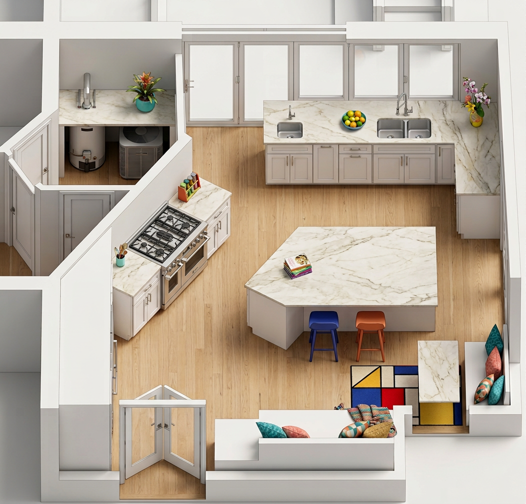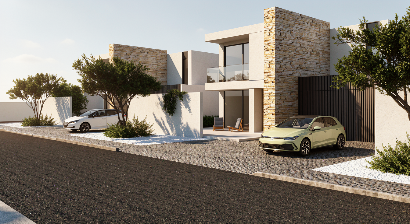 use the provided image as the base reference keep everything exactly the same do not redesign do not add or remove volumes do not change proportions camera or composition only apply the following precise corrections 1 stone volumes strict correction there must be exactly two vertical volumes clad in beige natural stone the right volume is already correct do not modify it the left tall volume must also be fully clad in the same beige natural stone use the exact same material tone texture and horizontal layering as the right volume do not create any additional stone elements do not change size height or position of any volume only correct material not geometry 2 white fa ades subtle improvement keep all remaining fa ades white apply a very subtle monolayer monocapa stucco texture matte finish refined not rough not exaggerated 3 windows important detail keep original openings exactly as they are add visible dark aluminum frames with realistic thickness subtle depth and shadow no frameless glass look 4 ground paving adoqu n correction the pedestrian and driveway areas must be light beige cobblestone adoqu n small scale stone pavers with visible joints slight irregularity and natural variation keep exact layout geometry and levels asphalt road remains unchanged 5 gap between volumes definition only improve the readability of the separation between architectural pieces enhance shadow lines and material transitions do not modify the design or create new elements 6 landscape controlled mediterranean keep existing trees and composition ground in gravel mediterranean xeriscape background flat mediterranean terrain with soft distant mountains add a few sparse pine trees light canopy not dense 7 lighting rendering style natural daylight late morning early afternoon soft shadows warm tone balanced exposure photorealistic editorial architectural style clean sharp high end visualization negative instructions critical no redesign no extra volumes no new stone elements beyond the two existing volumes no change in fa ade composition no change in camera or framing no change in window layout no smooth concrete paving no exaggerated textures no dense vegetation no dramatic lighting no people no geometry distortion