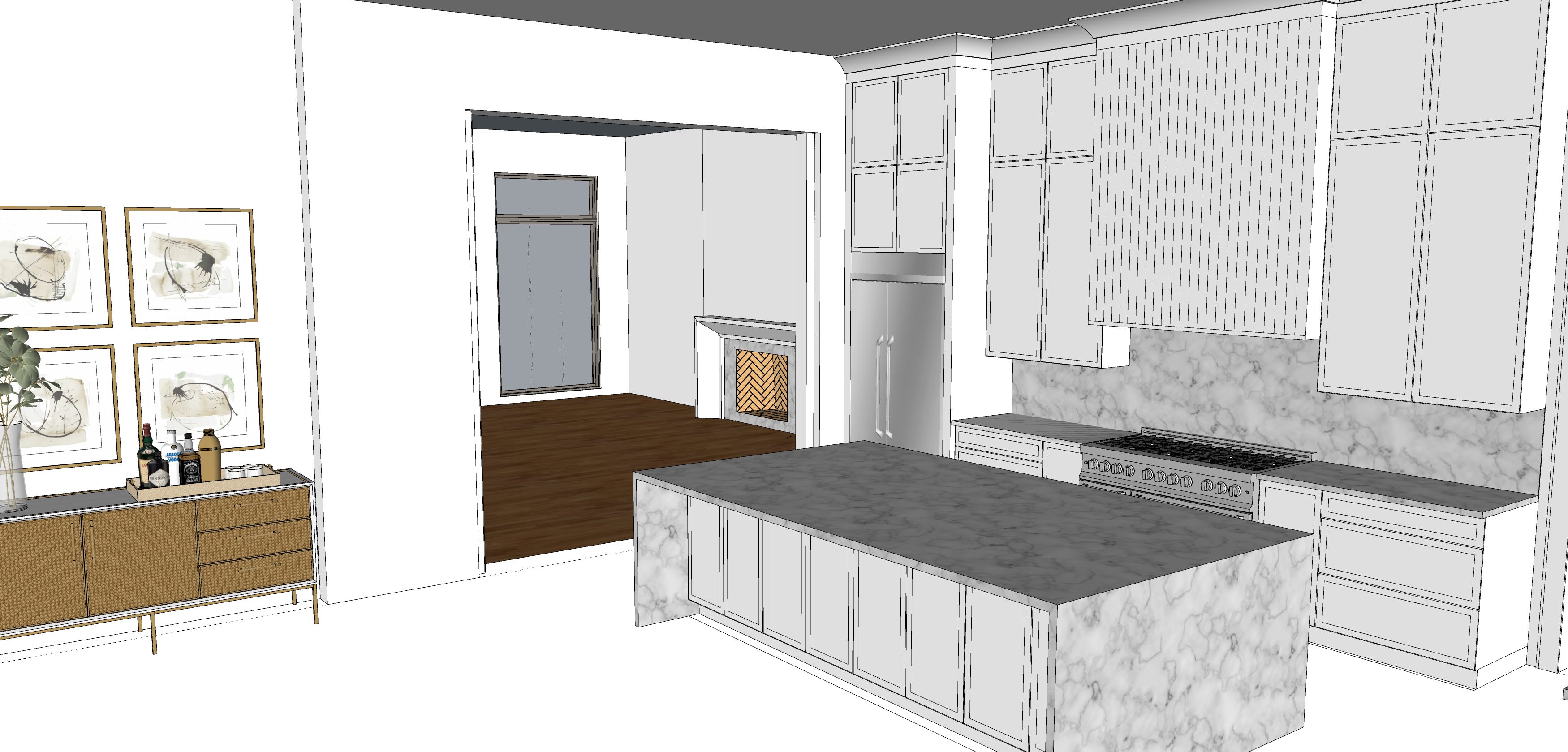 ender a modern kitchen and living space with a warm and inviting atmosphere use a soft white color for the walls and a rich white oak tone for the hardwood floors the kitchen cabinets should be a moody charcoal gray with sleek brass handles and the island should have a marble countertop with waterfall mitered edges and a subtle gray veining the backsplash in the kitchen will be the same marble as the countertop add a light rattan sideboard with a display of elegant liquor bottles and artwork above featuring soft abstract designs in beige and dark olive tones the ceiling is a light taupe to complement the walls emphasize natural lighting coming through large windows creating a cozy sophisticated ambiance the fireplace will be a modern stucco finish to compliment the area add a framed tv over the fireplace add 4 complimentary barstools
