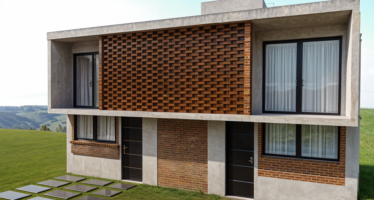 please preserve the original colors in the model the lattice should be rendered as novaceramic brick add curtains inside the top windows note preserve the walls inclination keep the novaceramic bricks on the wall in their position without giving them volume do not add any lights or extra elements