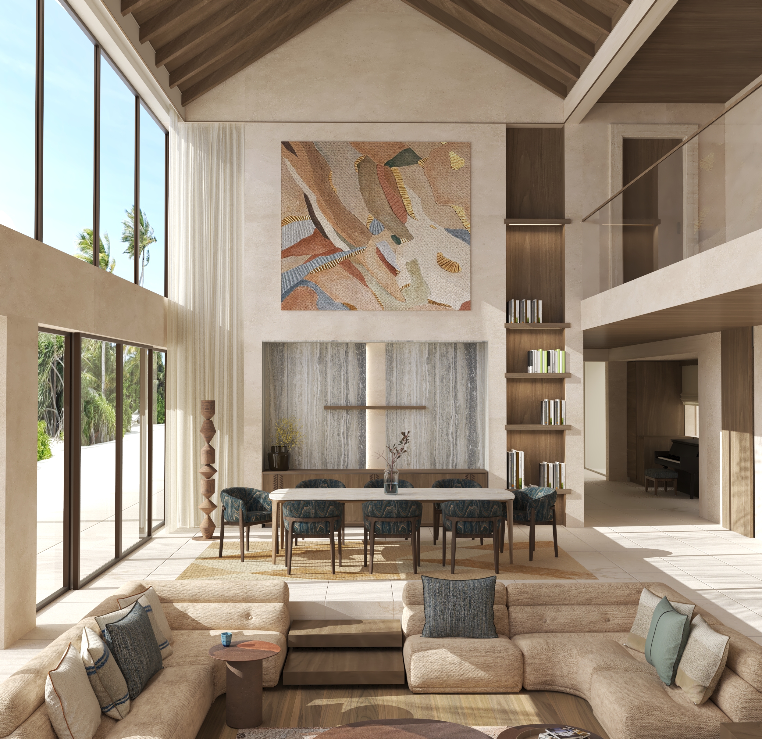 enhance this architectural render into a highly realistic polished visualization while preserving every existing architectural detail proportion material furniture placement lighting position camera angle and composition exactly as shown do not alter the building design structure layout dimensions openings finishes or any interior exterior elements maintain all architectural details exactly as they are improve only the overall realism image quality lighting balance reflections shadows textures material definition depth contrast ambient occlusion and natural atmosphere make surfaces look more realistic and refined with high end photorealistic rendering quality enhance glass reflections fabric textures wood grain stone finishes metal details and lighting softness without changing their original color or design keep the same mood and style of the original render but make it look like a premium professional architectural visualization with ultra realistic detail sharpness realistic daylight subtle shadows cinematic depth and clean post production