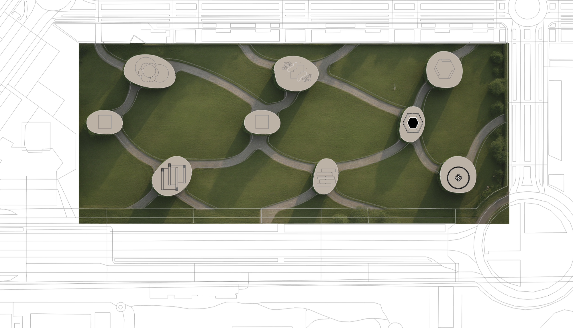 transform the image into a soft architectural site plan style similar to a competition or academic masterplan use a light desaturated color palette with pale greens and beige tones for landscape areas introduce trees with soft circular canopies and semi transparent textures integrated naturally into the open spaces keep buildings in clean white with thin precise linework maintaining clear floor plan readability highlight green areas and park zones while leaving pedestrian paths and circulation routes free continuous and clearly legible in light grey or white apply subtle shadows watercolor like textures and a hand drawn architectural atmosphere maintain correct scale proportions and original geometry avoiding photorealism the final result should resemble an architectural masterplan or site plan used in urban design presentations