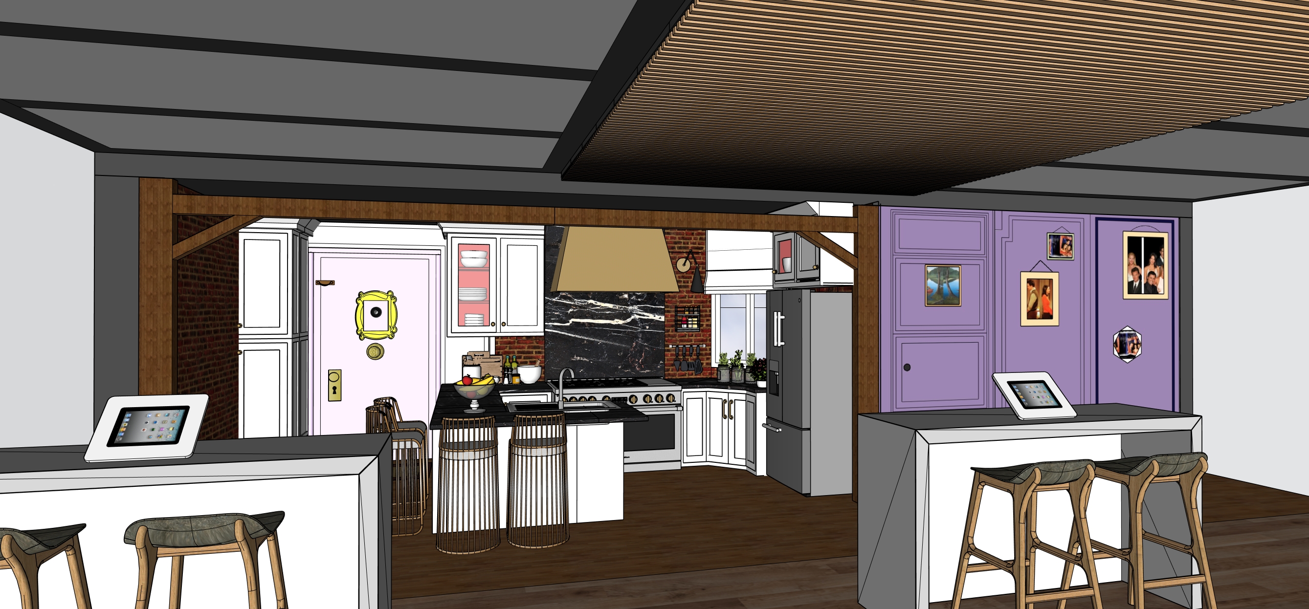 create a cozy stylish kitchen interior with a warm inviting atmosphere the wooden ceiling has a rich walnut finish the walls are light gray complementing the modern vibe use white for cabinetry adding a sleek contemporary touch the kitchen island features a black marble countertop providing elegant contrast include a brushed gold range hood for a luxurious accent add textured brick on one wall painted in a warm brick red incorporate a lavender accent wall with family photos framed in gold use dark brown wooden flooring to unify the space bar stools with dark wooden frames and soft gray upholstery add comfort ensure soft ambient lighting to enhance the overall warmth and appeal