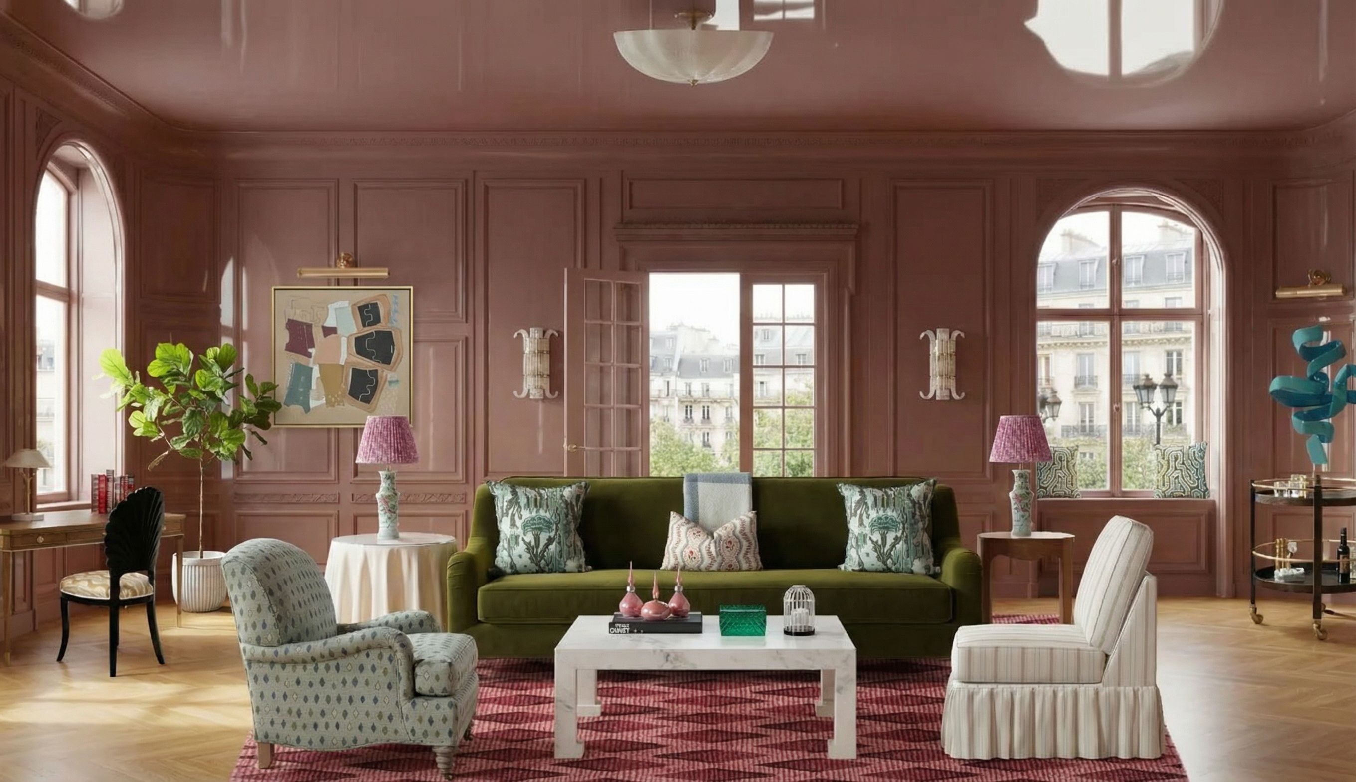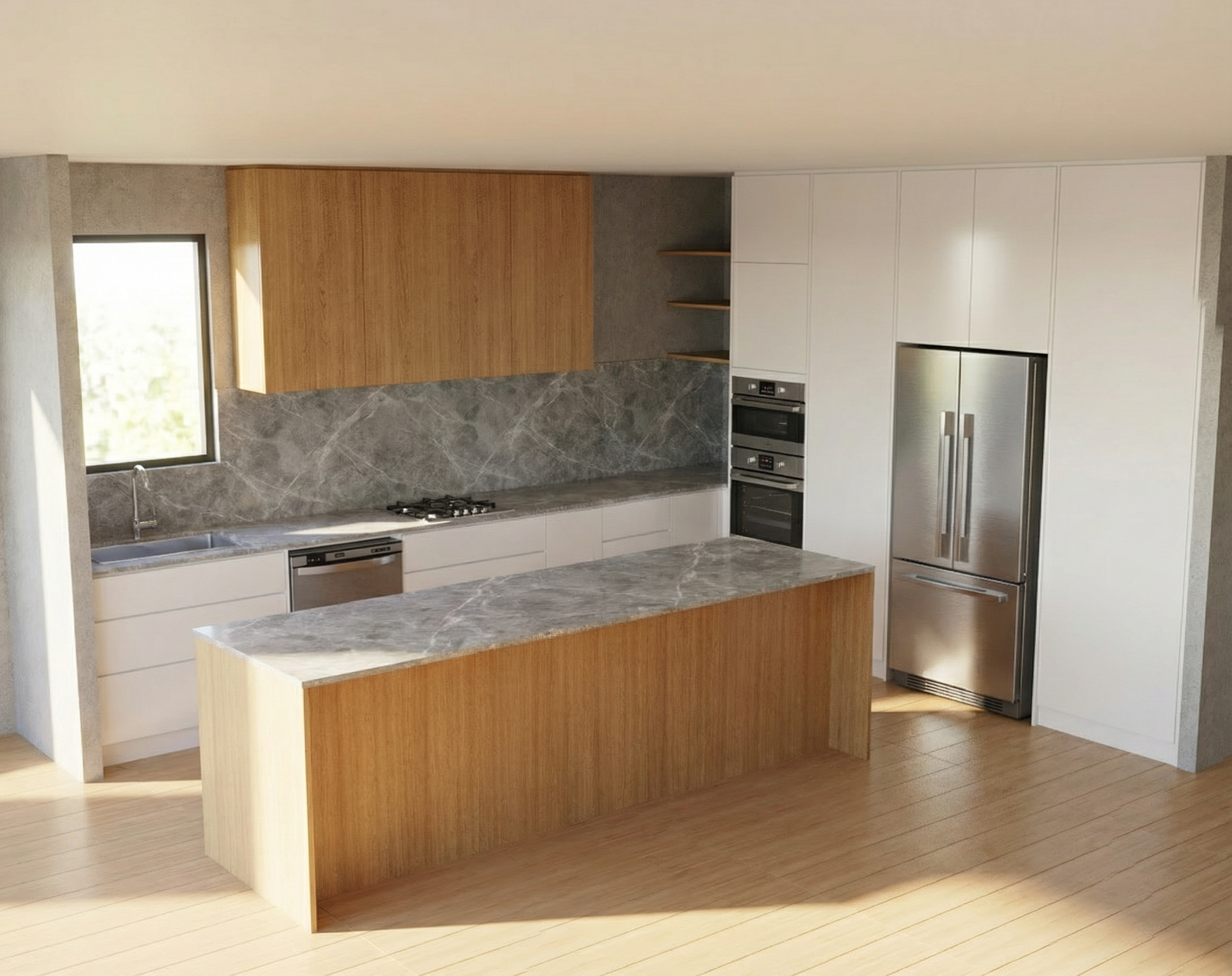add some decorations to the empty shelves near the sofa two cushions on the sofa a terrace with a small town behind the patio door and rays of sunlight inside