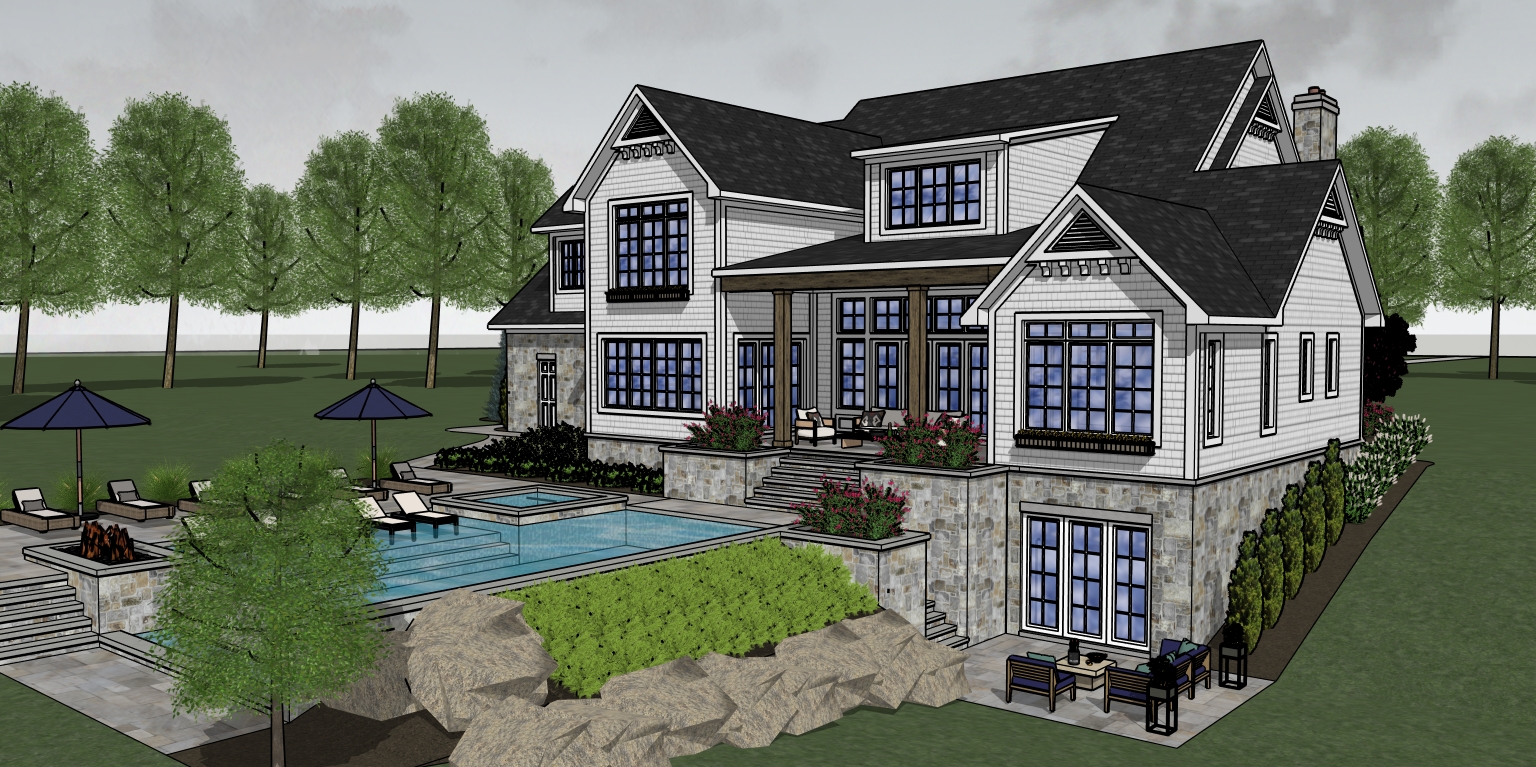 partly cloudy sky some deciduous trees in background add gutters and downspouts