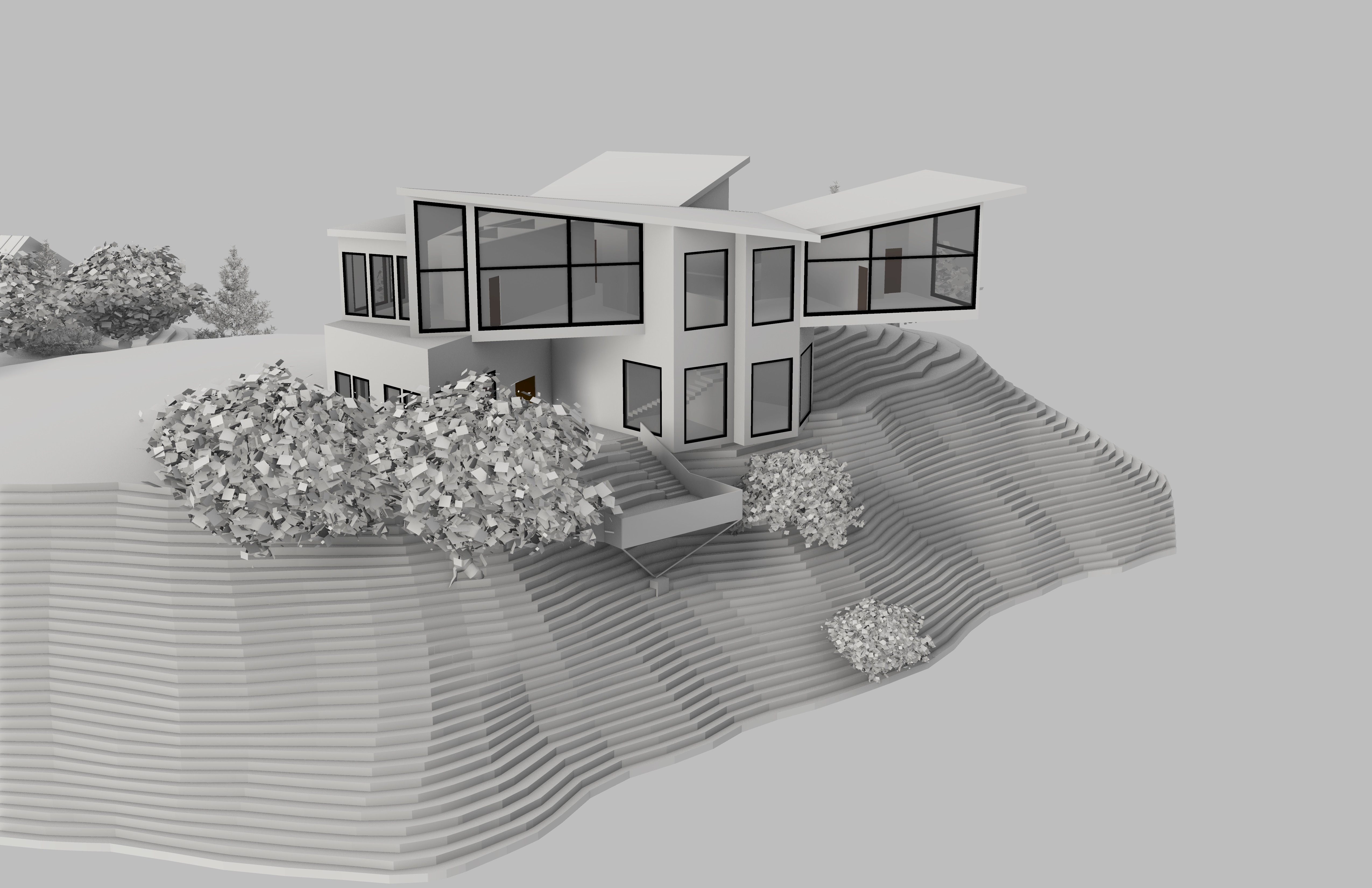 architectural watercolor rendering of a small contemporary research station perched on a rocky cliff structure made of warm wood black steel and glass precise and realistic architectural detailing cantilevered over stone terrain supported by steel beams surrounded by mountain pines and mist below rendered with crisp building geometry and realistic materials background and edges dissolve into loose watercolor washes and white paper edges not full bleed with soft unfinished fade around the image visible pencil and ink linework with light technical annotations artistic yet grounded balance of precision and painterly abstraction calm morning light concept architectural visualization style
