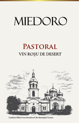 ultra realistic full wine bottle visualization using the exact provided label design show the entire bottle from top to bottom centered in the frame the bottle is a classic bordeaux wine bottle elegant proportions deep matte black glass premium appearance the label must be applied exactly as in the reference design without any modifications the label is printed on luxury white cotton textured paper thick and matte with subtle natural fibers visible at the very top of the label there is a very thin horizontal gold foil line extremely refined and elegant applied with hot foil stamping the gold line must be narrow and delicate not a thick band the word miedoro is printed in deep black elegant serif typography flat printed no embossing crisp and precise below it appears pastoral in refined dark red serif letters followed by vin ro u de desert in smaller serif text the lower area contains a fine engraving style illustration of an orthodox cathedral detailed black line artwork the bottle should have a dark elegant capsule on the neck matte black or deep dark tone consistent with premium dessert wine