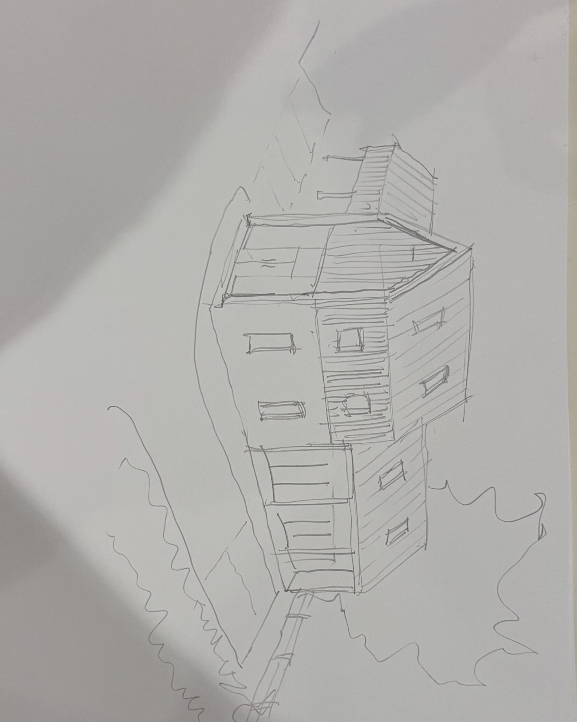 make this sketch look like a contemporary office building set in a countryside context using metal claddings timber cladding and brick
