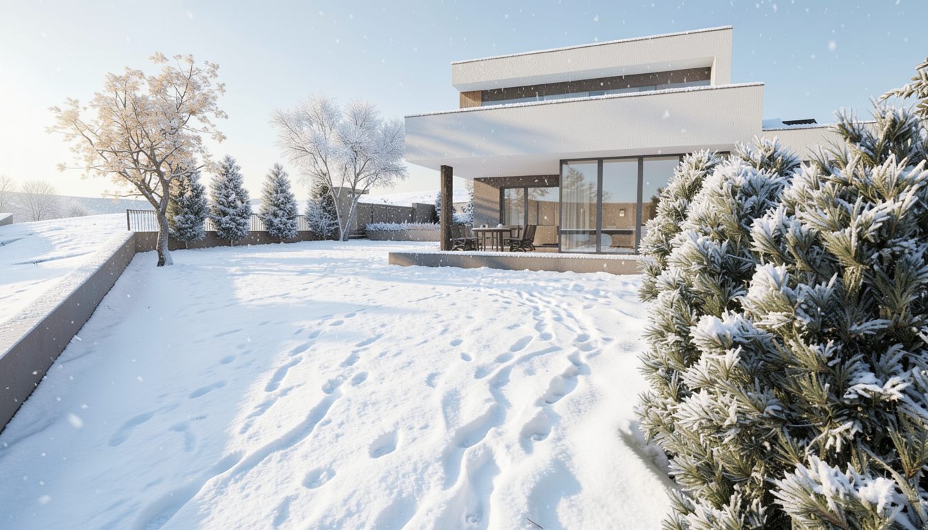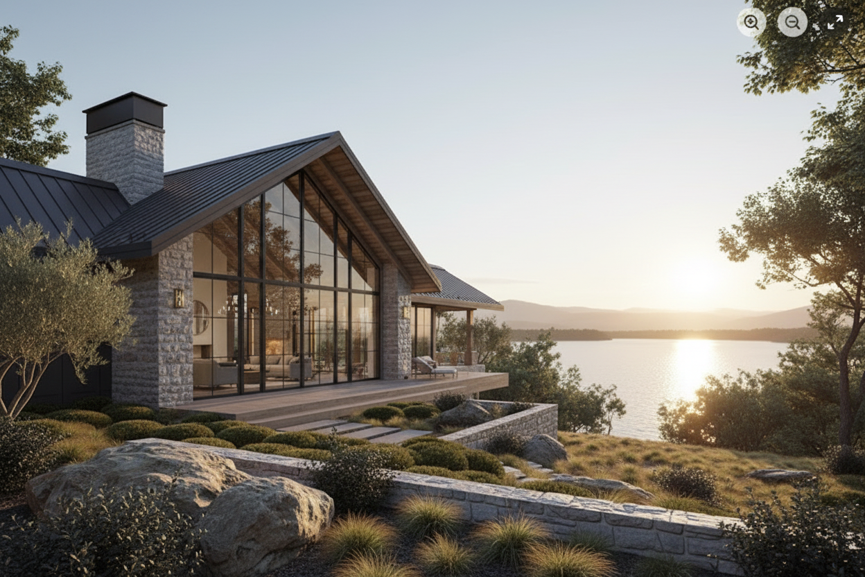 combine these pictures to make a perfect 2600 square feet house with cozy warm vibe luxury natural materials stone and wood balcony front facade facing a lake back sloping lot mediterranean look the render has to be different from the images