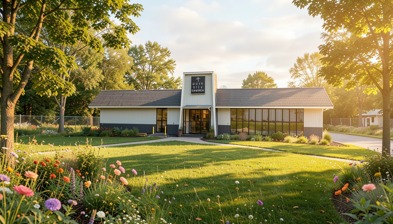 enhance photorealistic medium green grass clear image soft blue sky with billowy clouds with a morning sunrise on the horizon repair damaged sod and add a little landscaping around a few houses