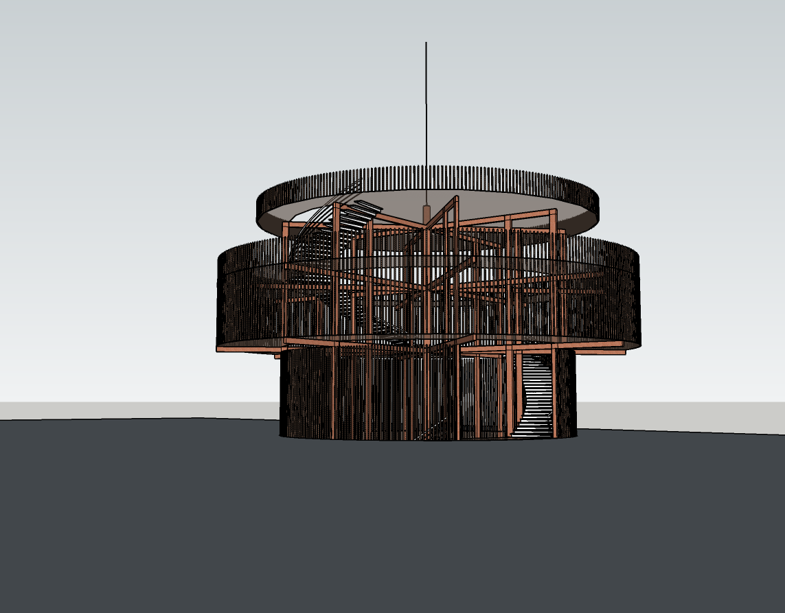 modernist exterior shot circular structure with 3 floors the infills are wooden strips that allow a glimpse inside where there is a spiral staircase along the entire height architecture