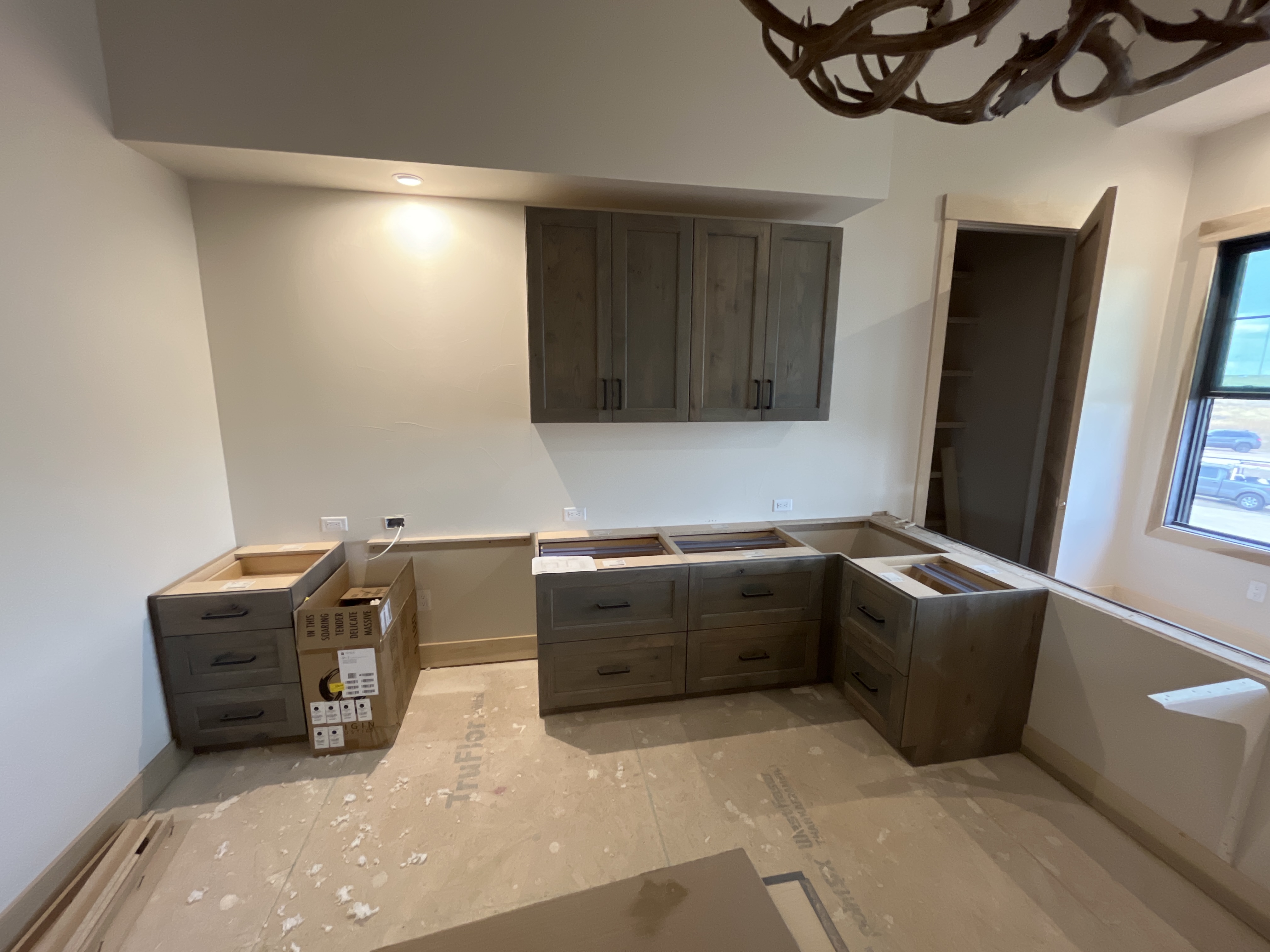 do not change the cabinets in any way preserve the exact cabinet colors materials finishes dimensions door and drawer styles hardware spacing alignment and all geometry exactly as shown do not alter the countertop shape backsplash appliances flooring lighting fixtures or wall structure only remove the construction materials clutter and mess from the scene clean the room and make it look finished and staged add a few simple tasteful home accessories appropriate for the style of the space but do not add or remove any furniture windows or architectural elements maintain the original lighting direction and realism enhance clarity and polish the photo while keeping the cabinetry and room design completely unchanged do not alter the lighting to keep the cabinet colors as they are in the image add new countertops and flooring add crown molding on the upper cabinets stage for a home office remove the trim around the window add a view of fields out the window remove the antlers