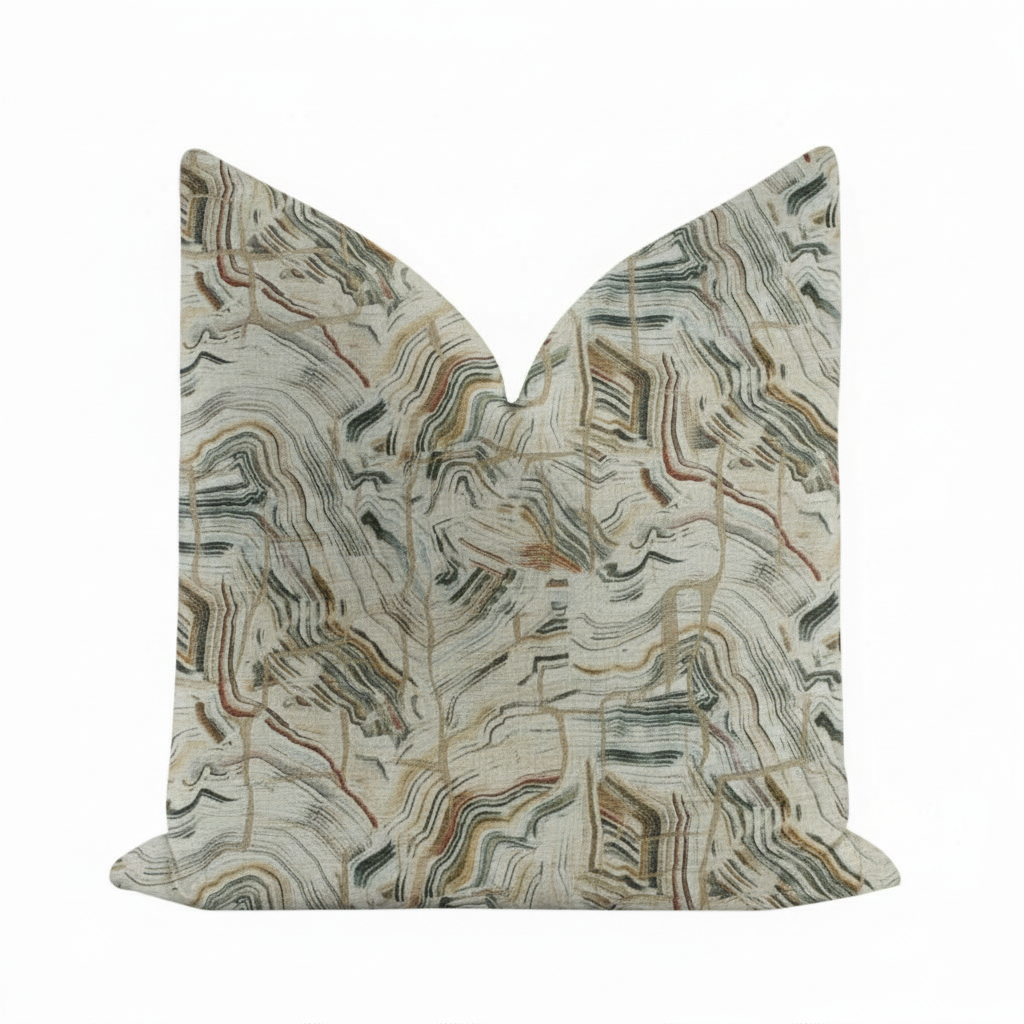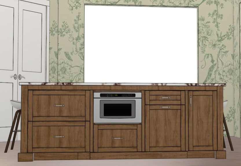the cabinets are stained rift cut white oak the countertop is white with red veins the wall pattern is wall paper the opening leads into a living room
