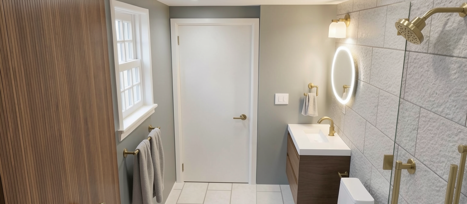 preserve all existing geometry materials and proportions lighting comes only from the vanity light mirror backlighting the mirror has a soft white backlit halo 3000k evenly diffused the vanity light scones are semi transparent white glass the shower head and all shower fixtures are not light sources and emit no light no lighting exists within the shower the wall wood panels remain unchanged overall scene is evenly brightened using neutral 3500k ceiling lighting only do not add highlights glow reflections or new light sources all fixtures and accessories have a brushed brass finish do not eliminate the glass panel between the shower and the toilet