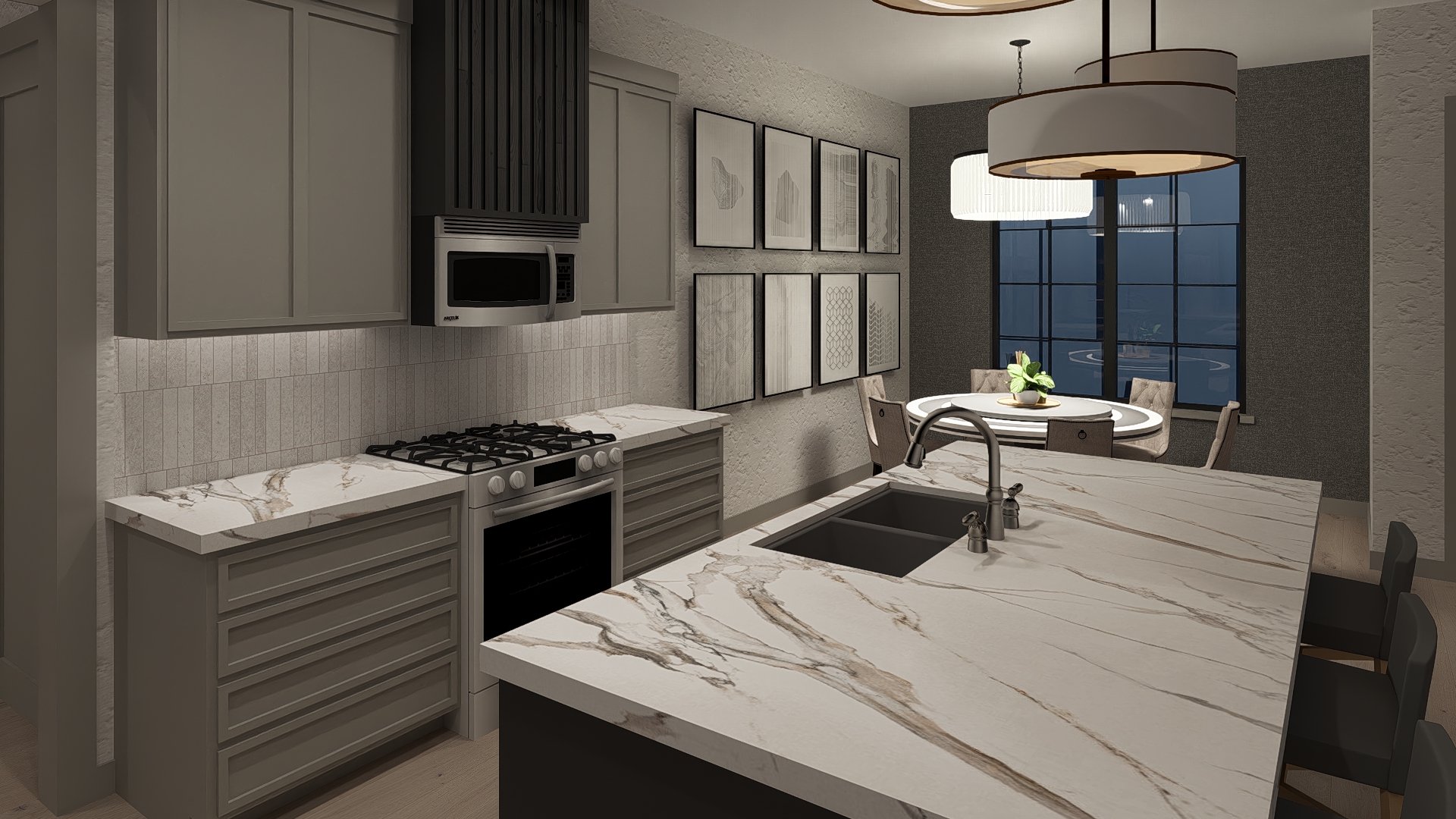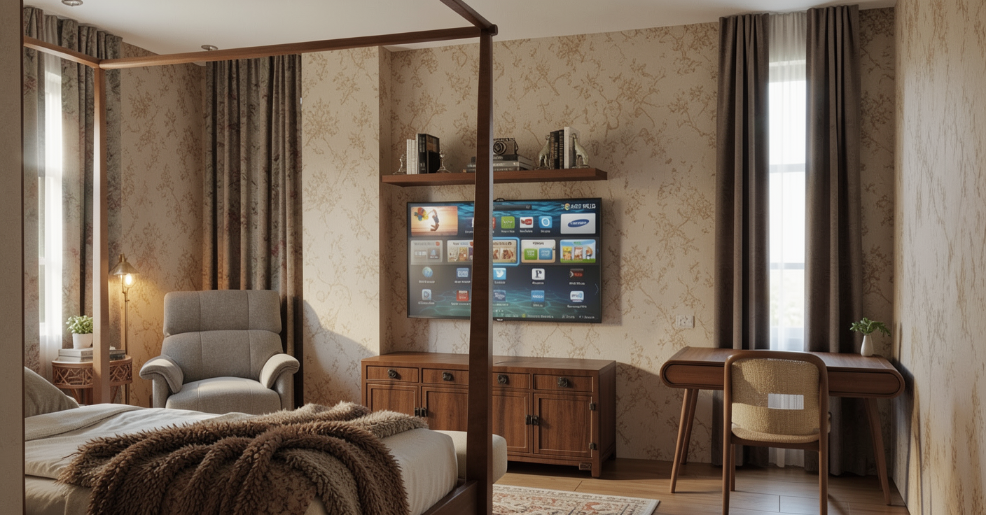 modern living room with a cozy atmosphere featuring a brick fireplace in soft beige and gray tones a wooden mantel with natural oak finish decorated with abstract framed black and white art pieces beside the fireplace a lush green potted plant in a brown wicker basket chairs and sofa in light cream with plush cushions surrounding a wooden coffee table with a black runner floor lamp in soft white light and textured walls in neutral gray a flat screen tv displaying colorful app icons adds a tech savvy touch warm inviting ambiance with subtle lighting effects