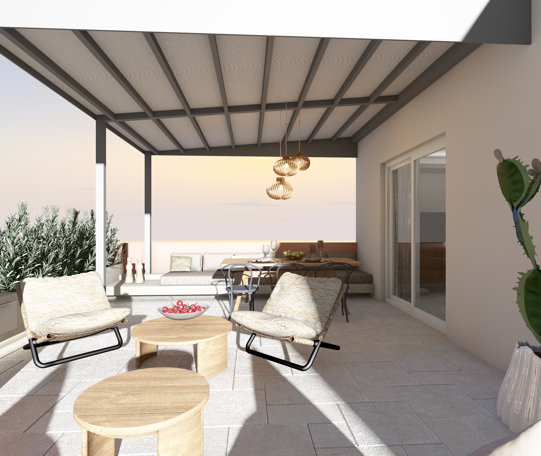 create a cozy and elegant outdoor living space a stone patio with light beige tiles surrounded by white cushioned seating and natural wooden beams the central focus is a large rustic wooden table place woven wicker pendant lights overhead casting warm soft shadows add textured earthy vases with lush green plants the atmosphere should feel serene and inviting perfect for a sunny afternoon