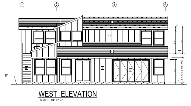 generate a realistic modern farmhouse rear west elevation rendering that matches the uploaded architectural elevation exactly in massing rooflines window placement balcony and proportions do not change architecture exterior materials and palette must match the approved front east elevation off white vertical board and batten siding warm natural wood trim accents at gables and posts charcoal asphalt shingle roofing black gutters white window trim gray stacked stone base replace the large central rear door with a t group premier frameless folding glass door system 6 frameless panels right stacking outswing configuration minimal black aluminum frame full height glass ultra thin sightlines recessed bottom track panels folding fully open to the right add a pergolux modern pergola centered over and aligned exactly to the width of the main rear folding door pergola style contemporary aluminum slat pergola dark charcoal finish flat roof slats width matches door opening projecting outward over patio mounted to rear facade with clean modern posts rear hardscape and yard simple large format gray paver patio directly under pergola rectangular clean layout aligned to house transition to flat green turf yard no plants trees shrubs or landscape beds minimal clean southern california new construction backyard lighting soft warm evening glow from interior and under pergola camera straight on rear elevation view capturing full pergola and door alignment