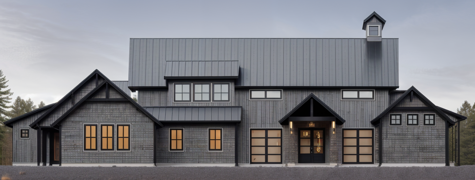 deconstructivism exterior shot black steel roof dark gray siding gray and white stone and medium brown wood accents architecture