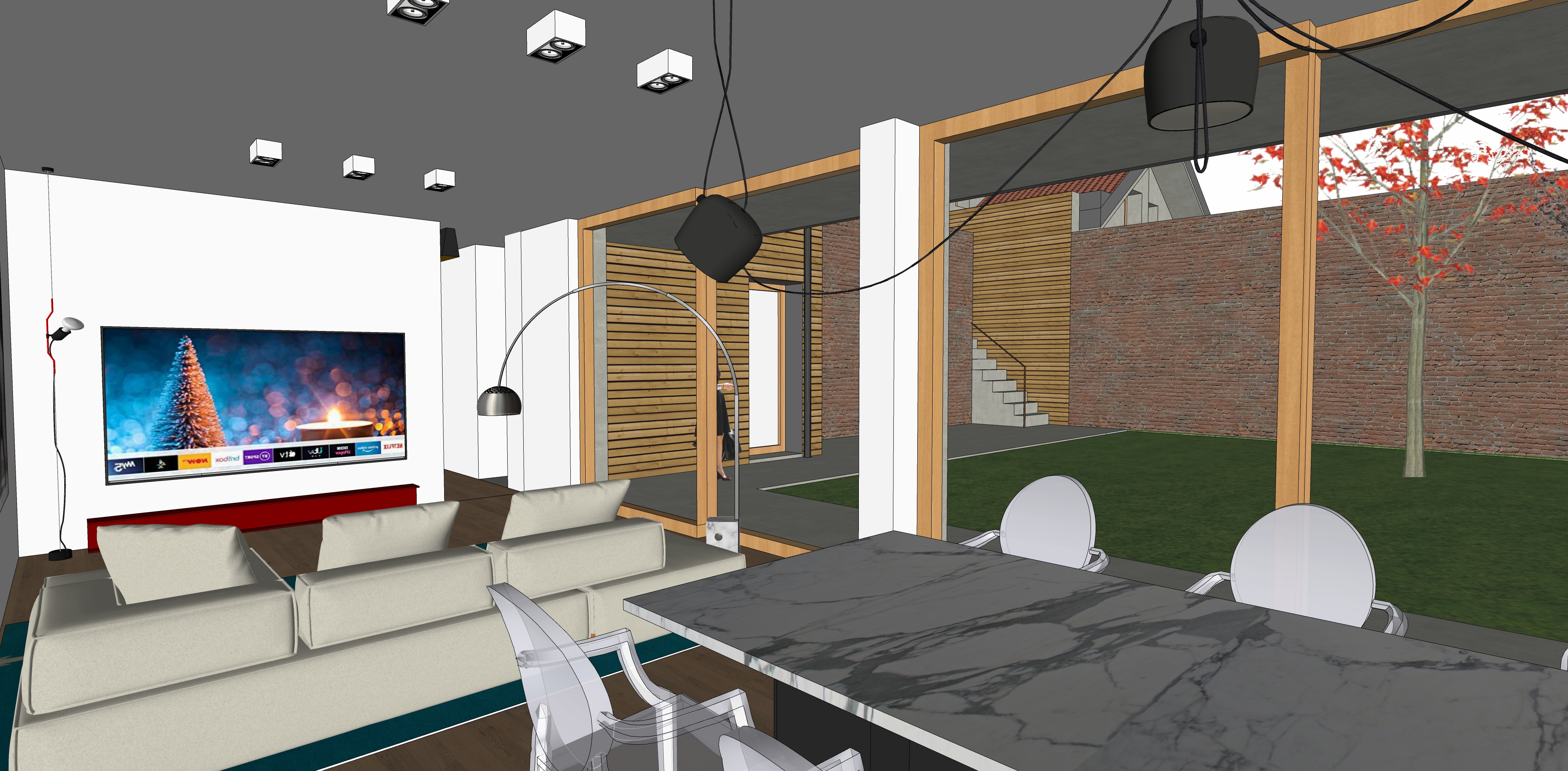 a modern living room with a large flat screen tv on a white wall the tv displays a vibrant scene with blues oranges and reds behind a large beige sectional sofa a sleek metallic floor lamp arches gracefully the ceiling is a deep gray adorned with square recessed lights to the right a dining area with a black marble table and transparent chairs adds sophistication in the background floor to ceiling windows with warm wooden frames provide a view of a lush garden with a brick wall and a tree showcasing autumnal red leaves the atmosphere is warm contemporary and inviting featuring a mix of natural tones and modern textures
