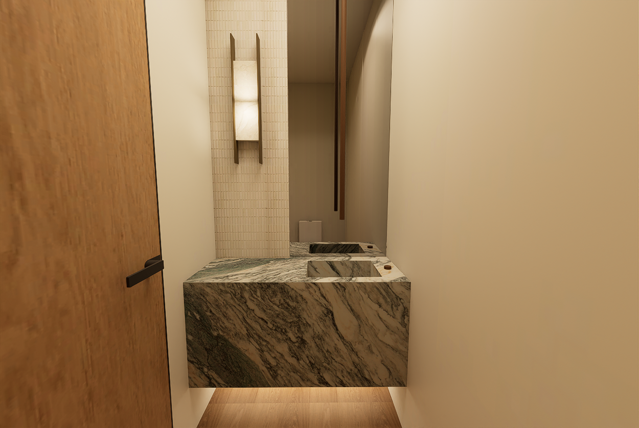 photorealistic interior render of a narrow modern powder room maintain exact geometry layout proportions and all existing materials from the model with no alterations walls finished in warm creamy off white roman clay plaster with subtle texture feature wall behind vanity clad in vertically stacked small format textured tile in a light neutral tone floating monolithic stone vanity in heavily veined marble with dramatic organic veining integrated rectangular sink no visible faucet fixture above the sink wall penetration only if present do not add or reinterpret faucet design tall narrow frameless borderless mirror mounted above vanity vertically aligned vertical sculptural wall sconce centered on tile feature wall with a rectangular stone or plaster backplate and slim dark metal side supports soft diffused glow warm color temperature 2700k minimal wood door with flat panel and dark hardware on left side light natural wood flooring with matte finish lighting is soft warm and moody powder room ambiance hidden recessed ceiling lighting not visible plus the single wall sconce as the primary visible light source no additional light fixtures emphasize soft shadows indirect lighting and realistic light falloff no overexposure no harsh highlights camera positioned at human eye level 5 ft straight on view centered on vanity tight space perspective with slight wide angle lens approx 24 28mm equivalent without distortion materials must appear highly realistic with accurate scale micro texture and subtle imperfections no added decor no styling objects no extra fixtures no redesign of any elements style high end architectural digest minimalist warm refined moody