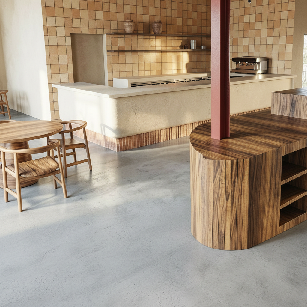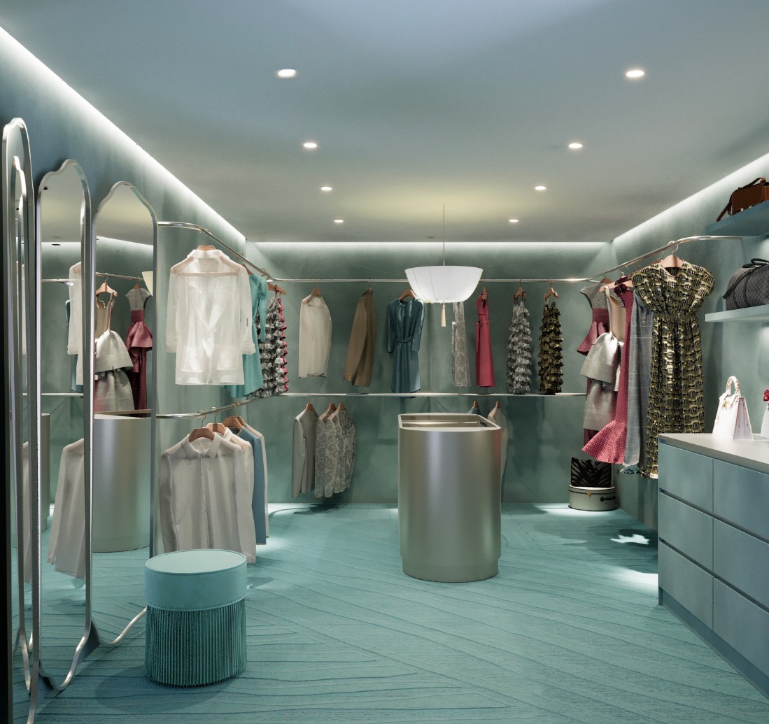 render this at 8k resolution changing the color of the walls and ceiling to a venetian plaster in ash color change the rug to ash color too on the right side reduce the size of the dresser and make it narrover so that only one drawer is shown on the image make the hanging part extended on the right side so that it occupies more space until the dresser keep the distance from dresser and hangin as is now change the size of the shelves so the new ones align with the new smaller dresser and change them to ash color too render this all 8k resolution