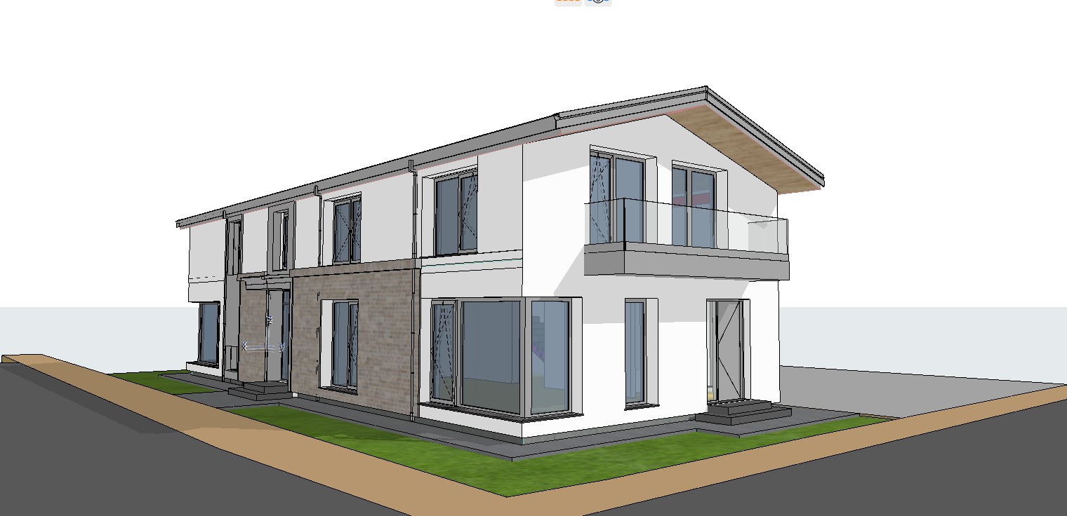 modernist exterior shot a beautifully rendered modern minimalist house set amidst a serene natural environment the house features angular wooden structures with a dark gray and black exterior large glass windows reflect the subtle hues of the surrounding landscape the wooden siding has warm earthy tones like soft browns and is combined with sleek contemporary black trimming the atmosphere is tranquil and the lighting is soft mimicking a gentle morning or late afternoon light the ground is adorned with patches of green moss and vivid yellow wildflowers adding a burst of color and life the surrounding trees are leafless drawn with delicate thin black lines indicating the late autumn season shadows of the trees create an intricate pattern on the house and the ground in varying shades of gray and brown the entire setting feels both modern and natural embracing simplicity and elegance architecture white facade keep windows from concept the background is forest please preserve the architecture and proportions of the building behind the building we have a slope and a forest