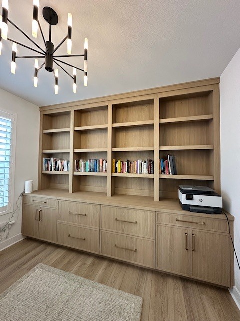 do not change the cabinets in any way preserve the exact cabinet colors materials finishes dimensions door and drawer styles hardware spacing alignment and all geometry exactly as shown do not alter the countertop shape backsplash appliances flooring lighting fixtures or wall structure only remove the construction materials clutter and mess from the scene clean the room and make it look finished and staged add a few simple tasteful home accessories appropriate for the style of the space but do not add or remove any furniture windows or architectural elements maintain the original lighting direction and realism enhance clarity and polish the photo while keeping the cabinetry and room design completely unchanged do not alter the lighting to keep the cabinet colors as they are in the image add new new rug restage the countertop and open shelves for a modern minimalistic office remove the blinds on the window