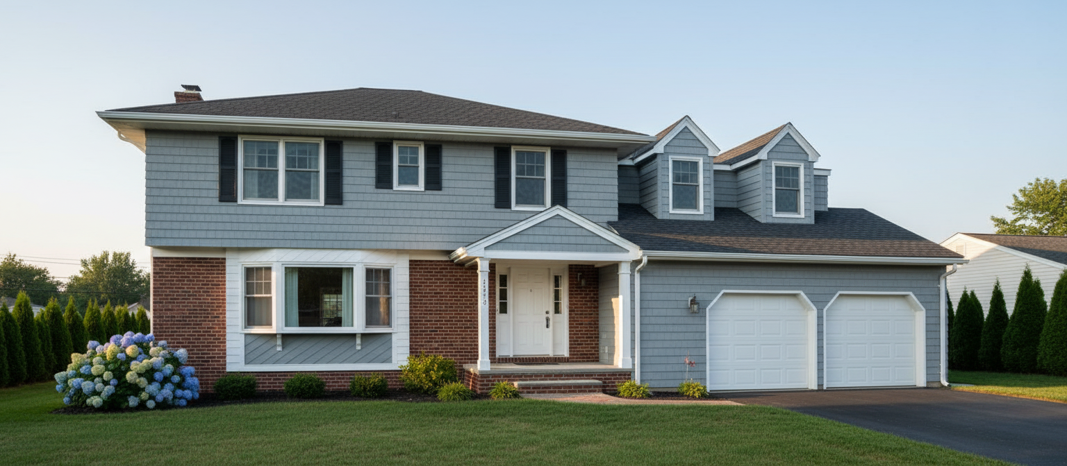 colonial revival exterior shot add dormers projections and dimensional character to front and height stucco and board and batten siding architecture