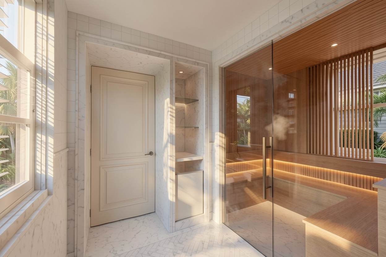 modify facade materials while keeping the architecture exactly the same keep the house design stairs landscaping sculpture windows roof and camera angle unchanged keep the existing limestone column on the far left side add a matching limestone column only on the far right corner of the house facade to balance the composition the new stone column must be located at the outer right edge of the building not near the door keep the large wall area beside the entrance as smooth white stucco do not add stone around the door or windows use light beige limestone blocks with clean horizontal joints similar to modern mediterranean architecture maintain a minimal elegant modern miami exterior