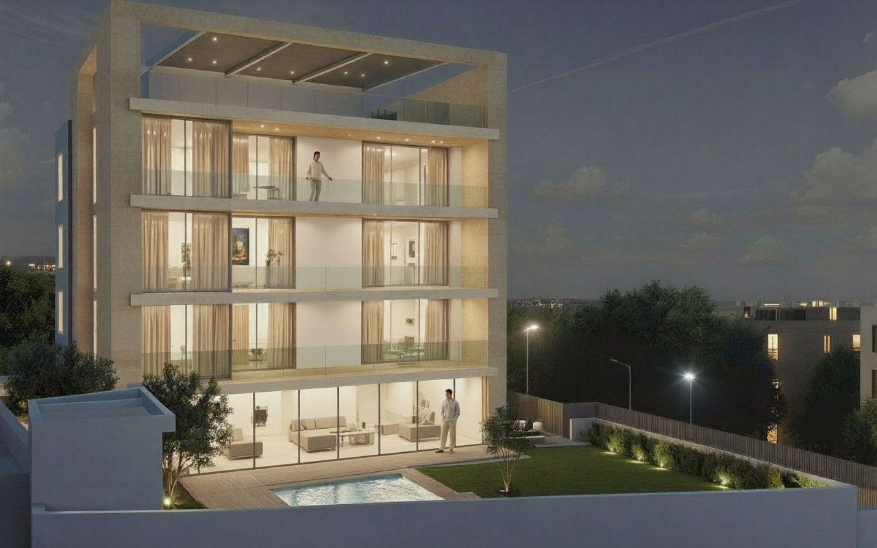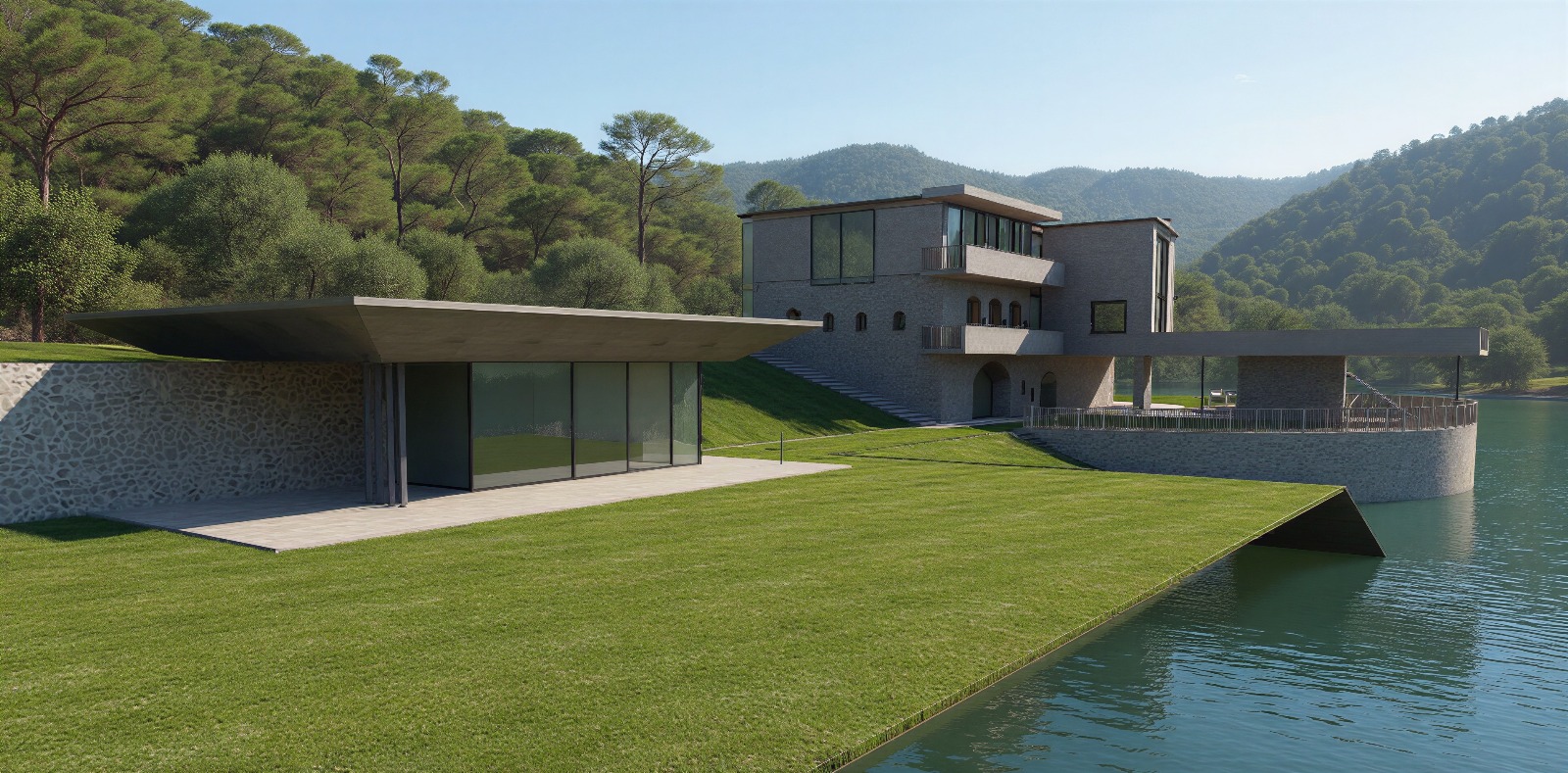 modernist exterior shot large transparent windows with furnishings inside outdoor kitchen behind the pillars architecture