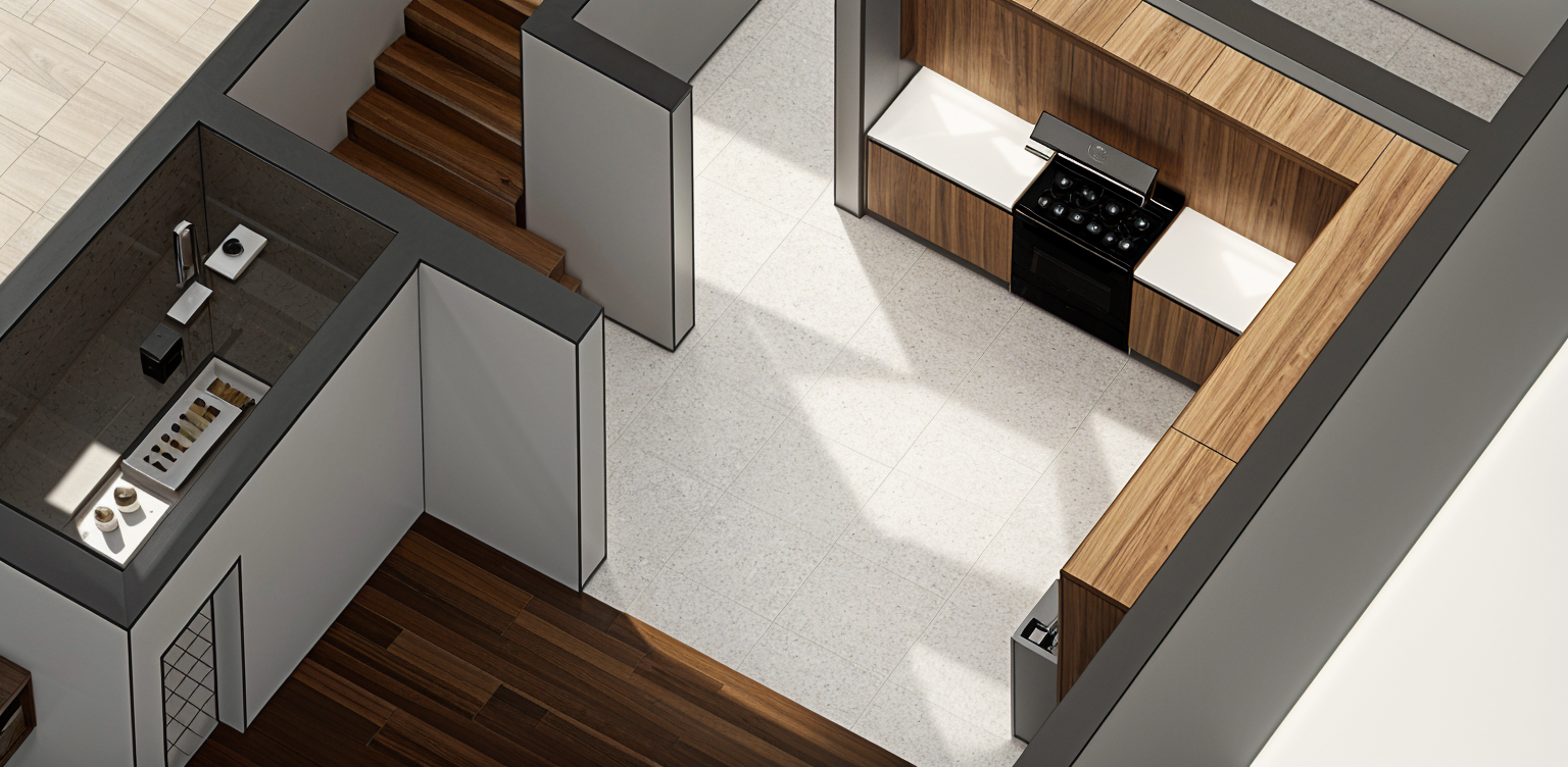 add a glass partition wall with wood frames x3 above the small kitchen backsplash light mat beige oak wood flooring installed in a herringbone pattern architecture