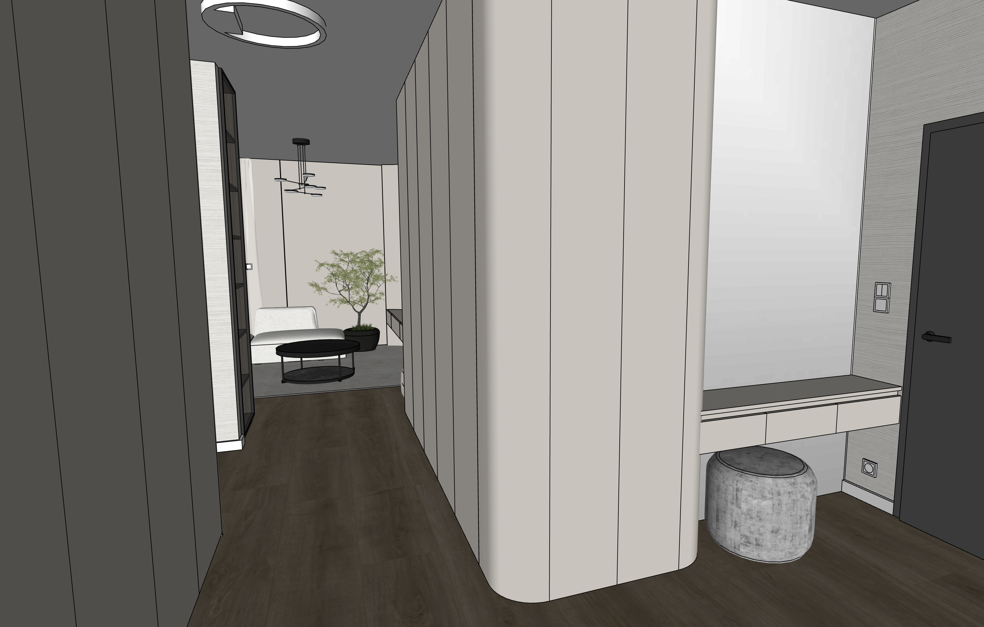 the furniture is all mate material the beige material is cashmere there is a mirror on the right