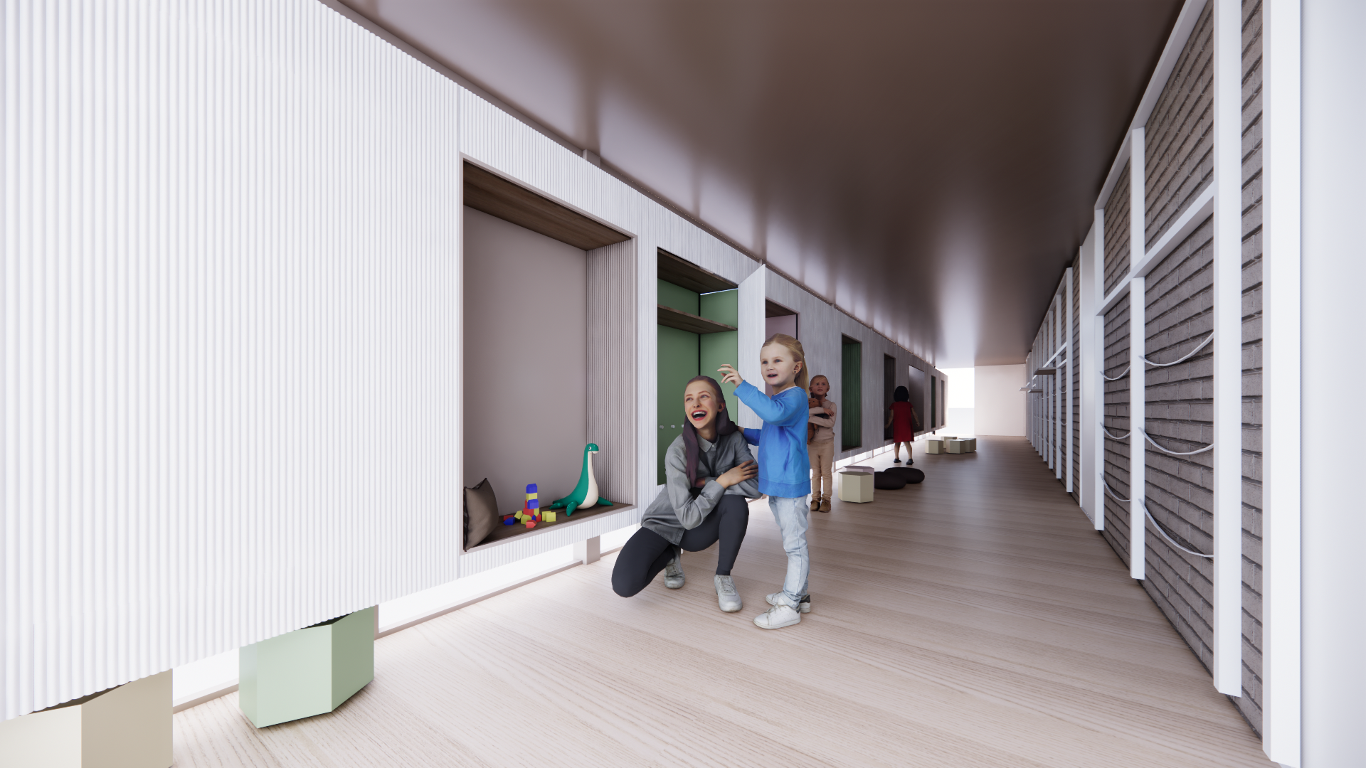 hyper realistic render of a modern children s hallway with soft natural lighting keep the original scene exactly the same recessed play niches white ribbed panels light wooden floor the children playing and the educator interacting with the child in the foreground replace only the ceiling material with the wood texture provided linear grain natural pattern but in a slightly darker and warmer tone with a matte finish use physically based lighting soft shadows and pbr materials maintain all proportions colors furniture and layout exactly as in the original image without altering or adding any other elements