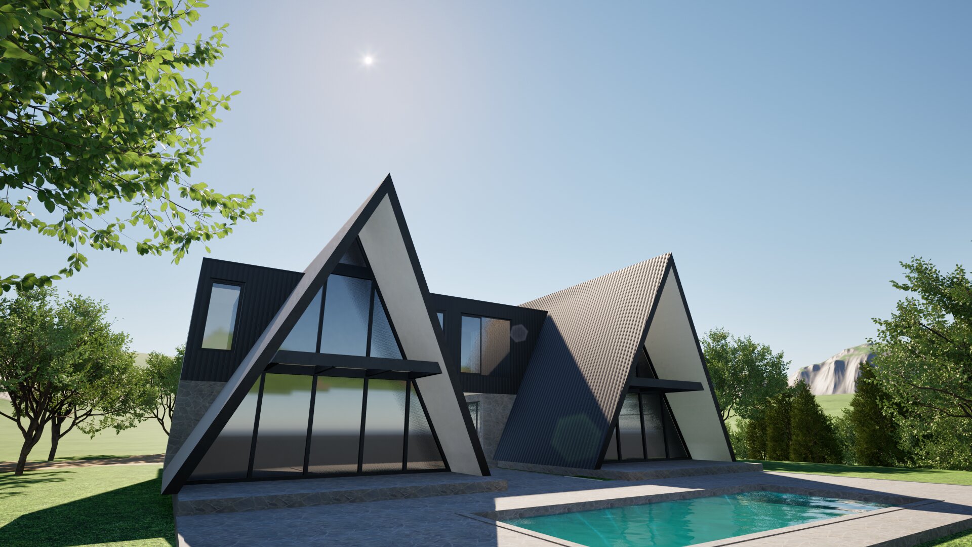make render more realistic add people party on pool glass is not reflective it can be seen inside let we see dinning table and sofa from outside