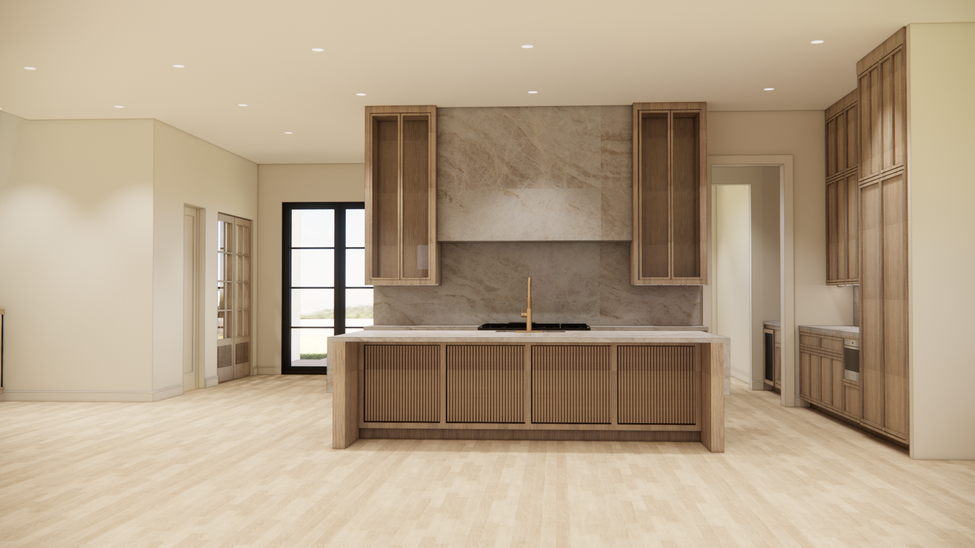 prompt convert this architectural rendering into a refined editorial quality interior photograph while preserving the exact architecture layout millwork profiles appliance locations ceiling heights and all material selections do not alter the design proportions or camera angle no additional appliances or architectural elements should be introduced the goal is elevated realism with sophisticated natural light not a reinterpretation of the space materials maintain exactly as designed flooring wide plank white oak hardwood natural matte finish warm undertones subtle grain variation authentic plank spacing and edge detail walls ceilings sherwin williams origami white sw 7636 soft warm white with accurate undertone and smooth level 4 finish counters taj mahal quartzite creamy beige base with soft linear veining natural depth and translucency realistic honed or polished reflection as shown appliances wolf and sub zero appliances maintain only the appliances shown do not add or modify enhance realism with accurate brushed stainless texture soft light reflection refined knob detail and true to life scale lighting direction editorial quality soft directional natural sunlight streaming through windows light should feel organic and atmospheric slightly diffused as if shot mid morning gentle shadow gradients across floors and cabinetry subtle bounce light warming the white oak flooring soft under cabinet lighting at 2700k 3000k diffused and integrated no visible led strips no harsh hdr no blown out windows no artificial glow editorial photography style high end luxury residential editorial photography full frame camera 28 35mm lens perfectly straight verticals slightly softer depth of field for warmth balanced exposure with gentle highlight roll off refined contrast not overly sharp natural tonal warmth complementing white oak and taj mahal quartzite realism enhancements add micro texture to quartzite and wood grain subtle imperfections in stone veining for authenticity realistic shadow density under cabinetry and toe kicks soft reflection in appliance surfaces not mirror like remove all cgi flatness