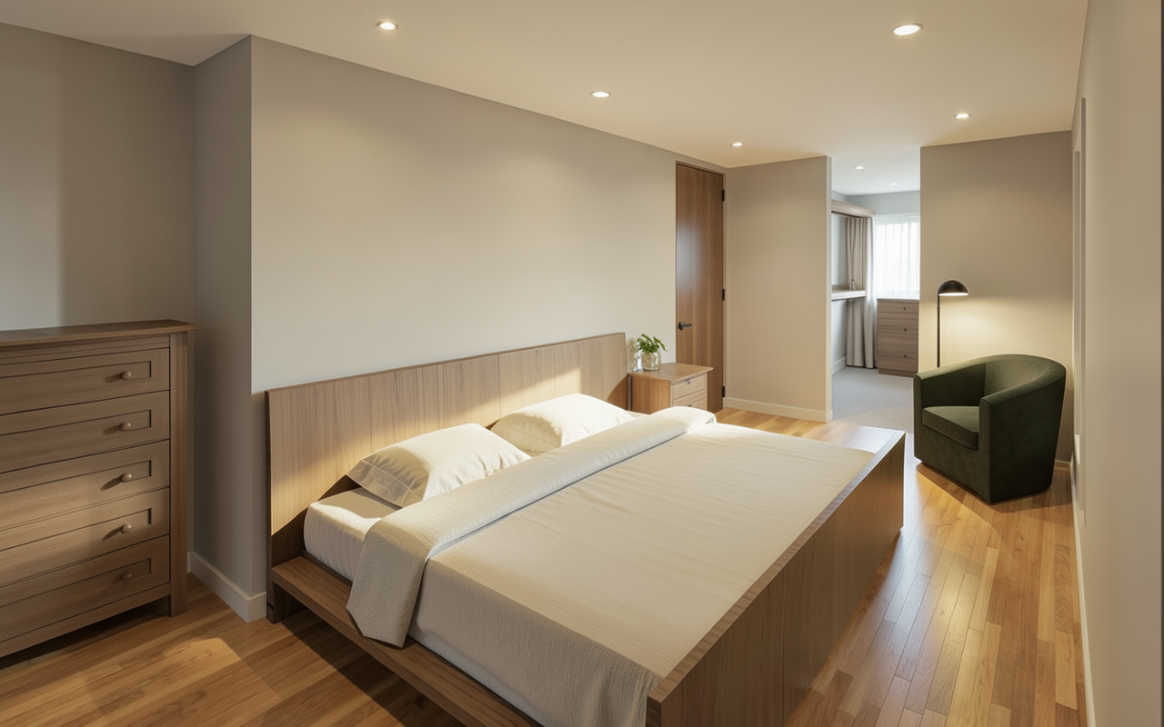 exterior shot one story building with wooden facade add trees and grass and keep windows and door as they are
