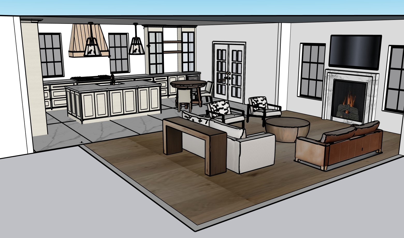 create a luxurious modern living and kitchen space with a cozy atmosphere use warm beige and cream tones for the cabinetry and kitchen island with countertops in a polished black finish add textured light wooden flooring creating a seamless transition to the living area the windows are large with a deep charcoal gray frame allowing natural light to flood in the living area features a contemporary beige sofa set and elegant armchairs with simple abstract black and white geometric patterns position a rustic round wooden coffee table in front of the sofa the tv is mounted above a marble fireplace with a roaring fire to enhance the cozy ambiance use soft warm lighting from modern pendant lamps with an industrial black finish hanging above the kitchen island incorporate a rich brown leather finish for the backing of the armchair and sofa create a serene evening glow capturing a tranquil and inviting atmosphere throughout the room