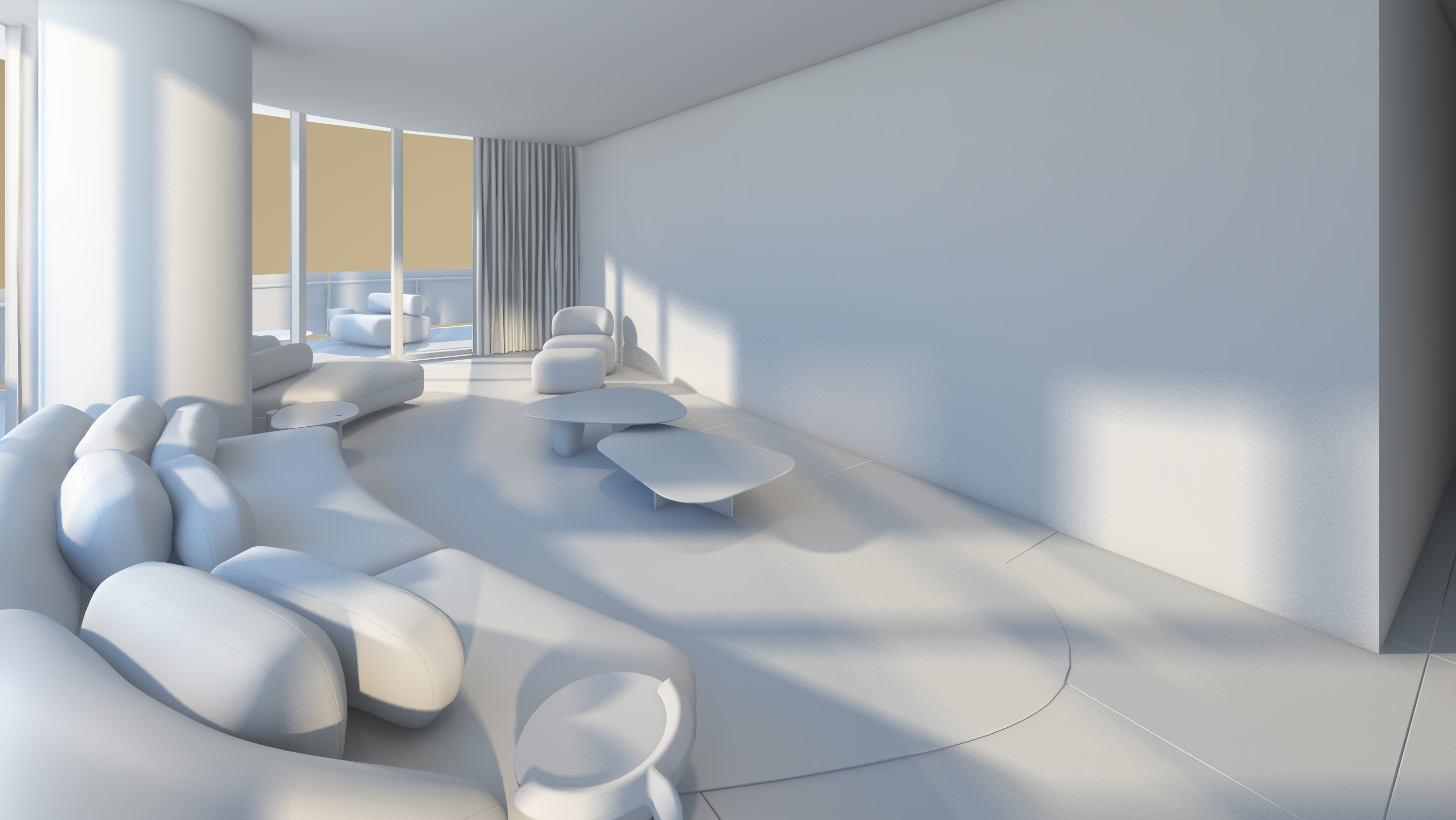 crea un ambiente calido con luces y sombras la vista de fuera es el mar respeta la distribucion de muebles solo adiciona texturas claras en la pared crea un mueble en toda la pared donde tenga shelves areas con luces zonas de storage coloca un tv y los materiales serian taupe claro pero creando contrastes madera bleach gris claro ambiente con luces y sombras detalles de alta calidad las coffee tables que esten mas en el centro del espacio el tope de las mesas que sean de marmol verde con betas champange