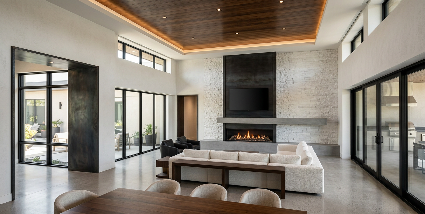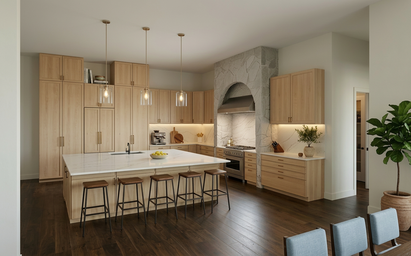 enhance realism of current trees shrubs and grass without altering their shape scale or placement enhancement limited to foliage subtle tonal variation remove flat color blocks natural grey green dusty olive variations light translucency through leaves internal canopy shadow layering micro detail refinement remove plastic cgi smoothness grass visible individual blade texture slight height variation within existing boundaries natural color inconsistency soft shadow breakup no expansion of grass areas trunks branches refined bark texture natural tonal layering micro surface irregularities preserve exact trunk dimensions no geometry regeneration no shape alteration no scale modification global photographic refinement improve natural light interaction enhance shadow realism add subtle atmospheric depth maintain original exposure balance maintain original composition maintain original framing remove cgi smoothness photographic realism only no stylization no redesign no additions prohibited actions non negotiable no new vegetation anywhere in the image no density increase no layout changes no scene rebalancing no architectural changes no material replacements strict enhancement pass only scene integrity must remain unchanged