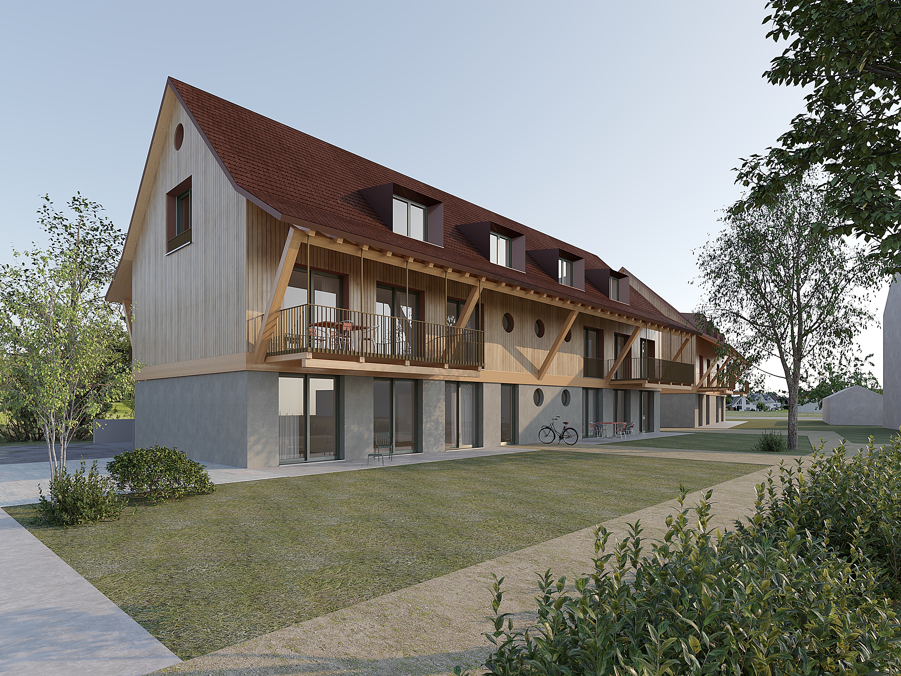 create a realistic photograph of an exterior image in a plot near a small town the roof has dark orange roof tiles in the ground floor the walls of the building are plaster in grey color the first floor is in wood panels the garden has nice and wild gras not so tall keep the geometry of the building make it in clear morning sunlight