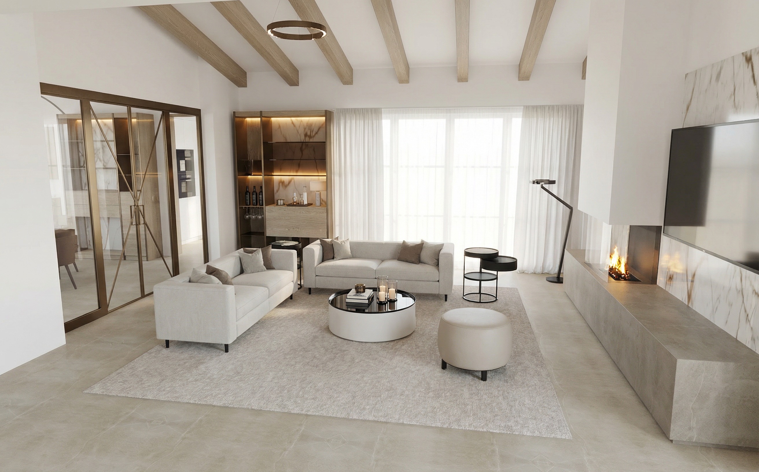 keep interior design and furniture position as it is realistic photo of a living room with fireplace in daylight white beams door as it is out of glas with metal bronze brass frame but without diagonal bracing