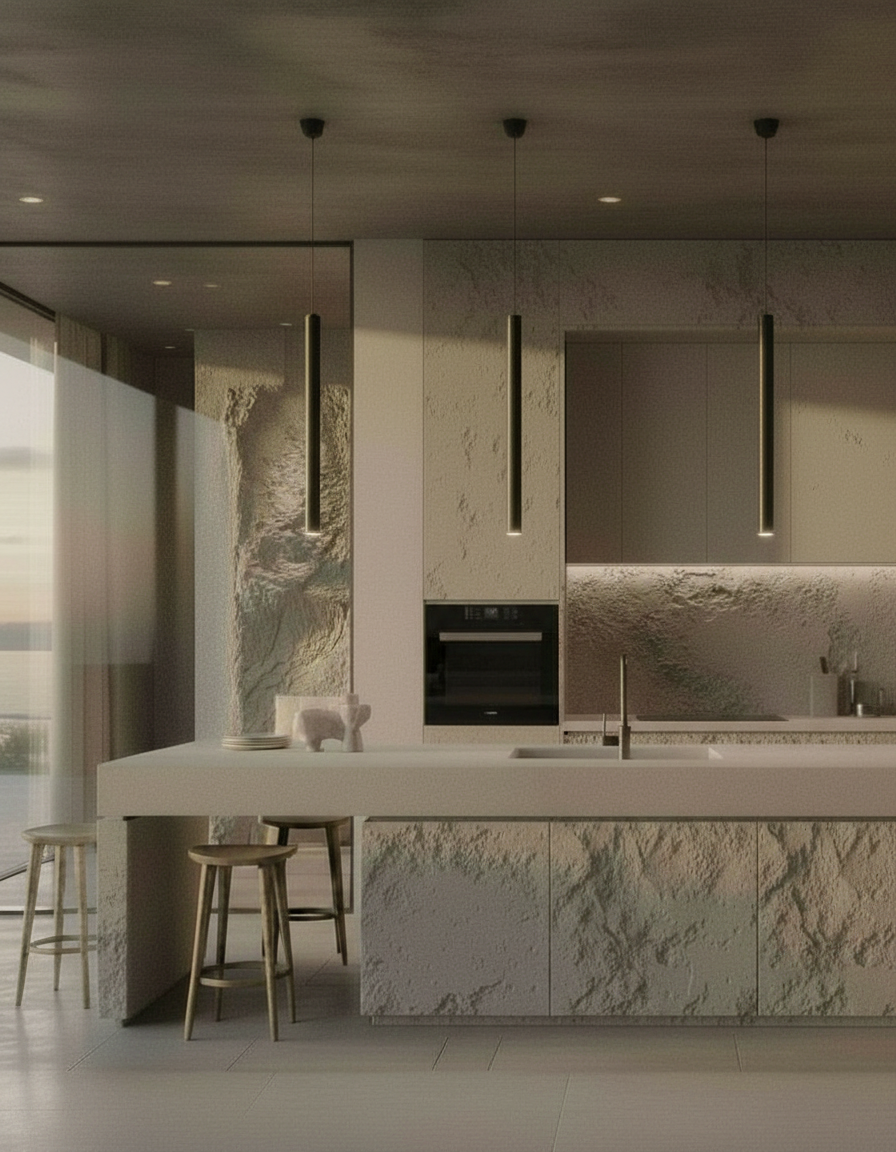 let it be more realistic places with vertical grout lines should be wooden cabinet doors should be light solid color there should be no handles keep the models the same there should be led lighting under the cabinets daylight should come from the window on the left inside the upper glass doors there should be glasses and plates let tea brew on the stove there should be a fruit bowl on the countertop appliances should look realistic