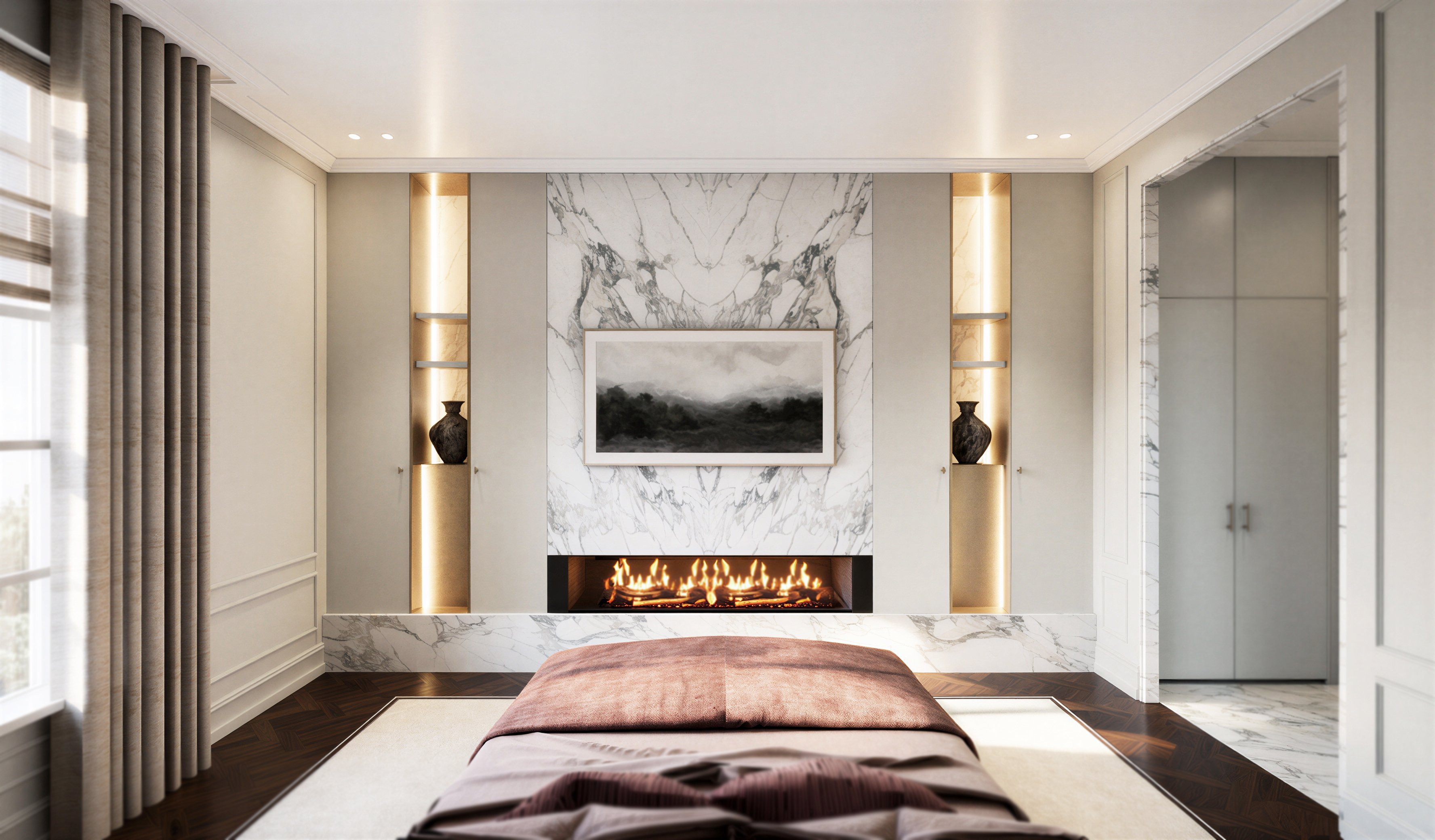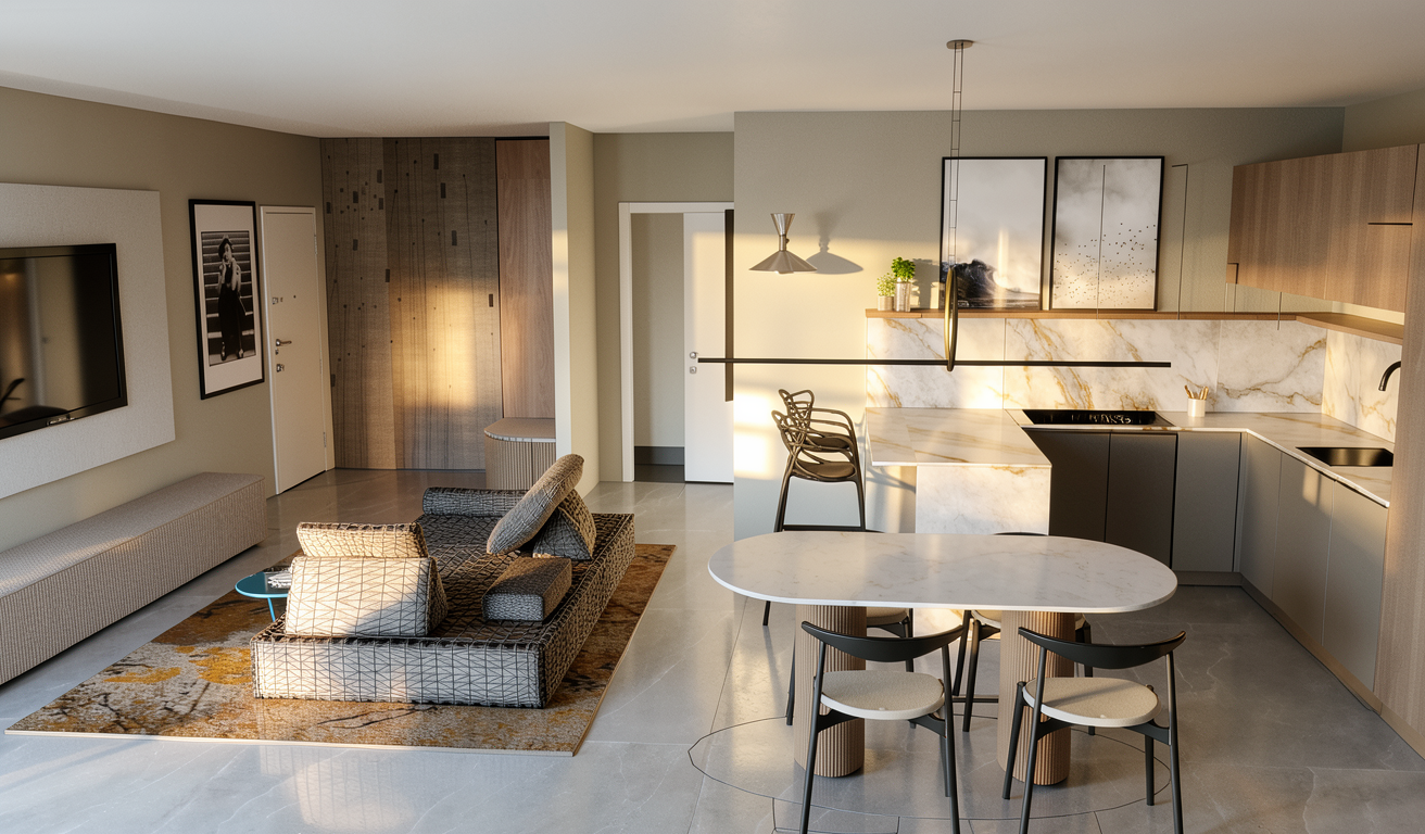 transform this photorealistic image from a daytime scene into a cinematic high end evening atmosphere mandatory preservation strict keep the image exactly the same in composition layout proportions and camera angle do not change any materials objects textures or design elements do not add remove or move anything color material lock preserve all original colors and materials exactly no color shifts in surfaces or objects maintain the original palette only perceived warmth through lighting lighting transformation only cinematic convert daylight into a warm luxurious evening setting approx 2700k 3000k introduce soft layered interior lighting like in a high end hotel or luxury residence create warm light accents and gentle falloff brightness control critical the scene must remain well lit do not make the image too dark maintain clear visibility of all materials and details balance between evening ambiance and functional lighting no underexposed areas or loss of detail mood luxury cinematic warm intimate and sophisticated atmosphere elegant contrast but still bright and readable premium calm high end hotel feeling window exterior exterior should appear darker blue hour early night slight cool tone outside to contrast with warm interior lighting no new elements only lighting adjustment realism physically accurate lighting with natural shadow transitions subtle reflections enhanced by warm light no artificial glow or overexposure rendering style cinematic architectural photography soft depth refined contrast premium finish negative constraints strict no redesign no material changes no color changes in objects no added objects no stylization or artistic reinterpretation no dark or underexposed result only transform the lighting into a warm cinematic evening atmosphere while keeping the scene clearly visible and well lit everything else must remain identical