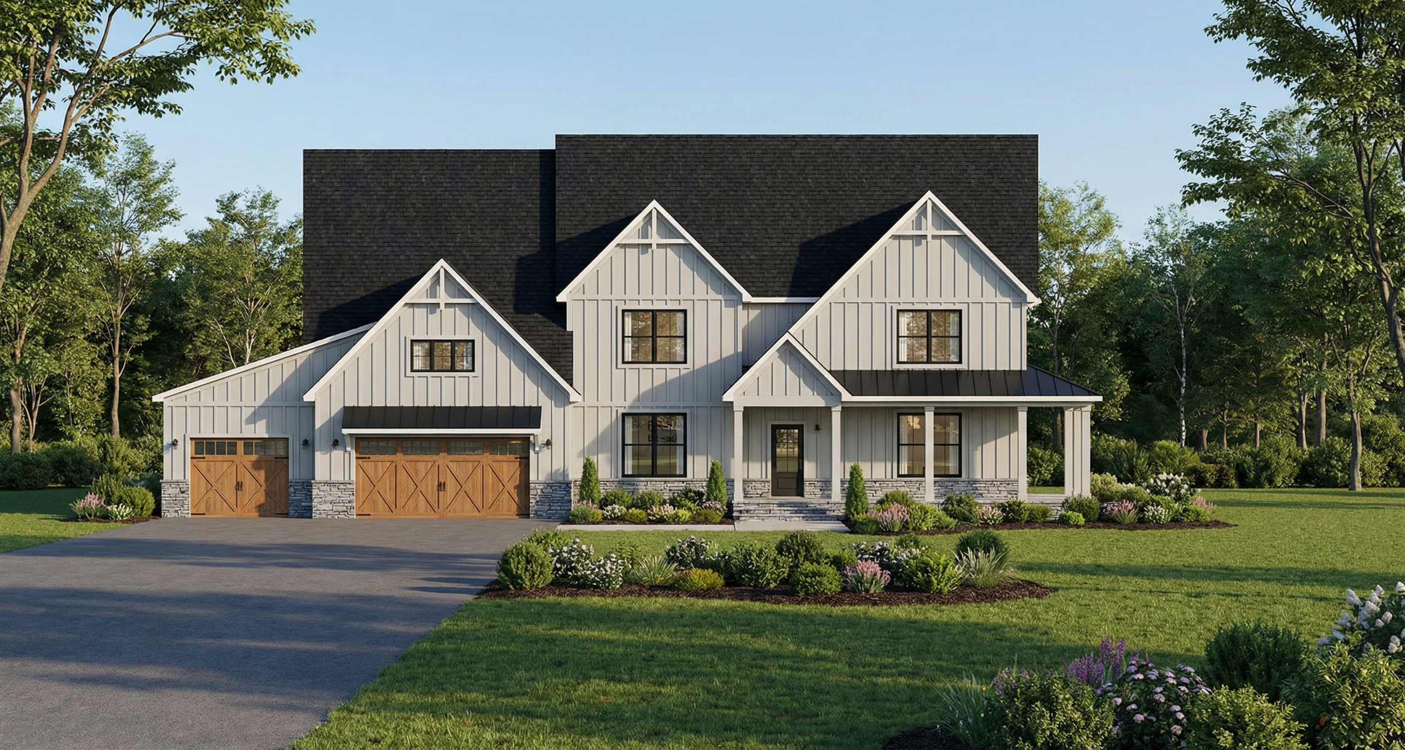 white exterior black window frames planters