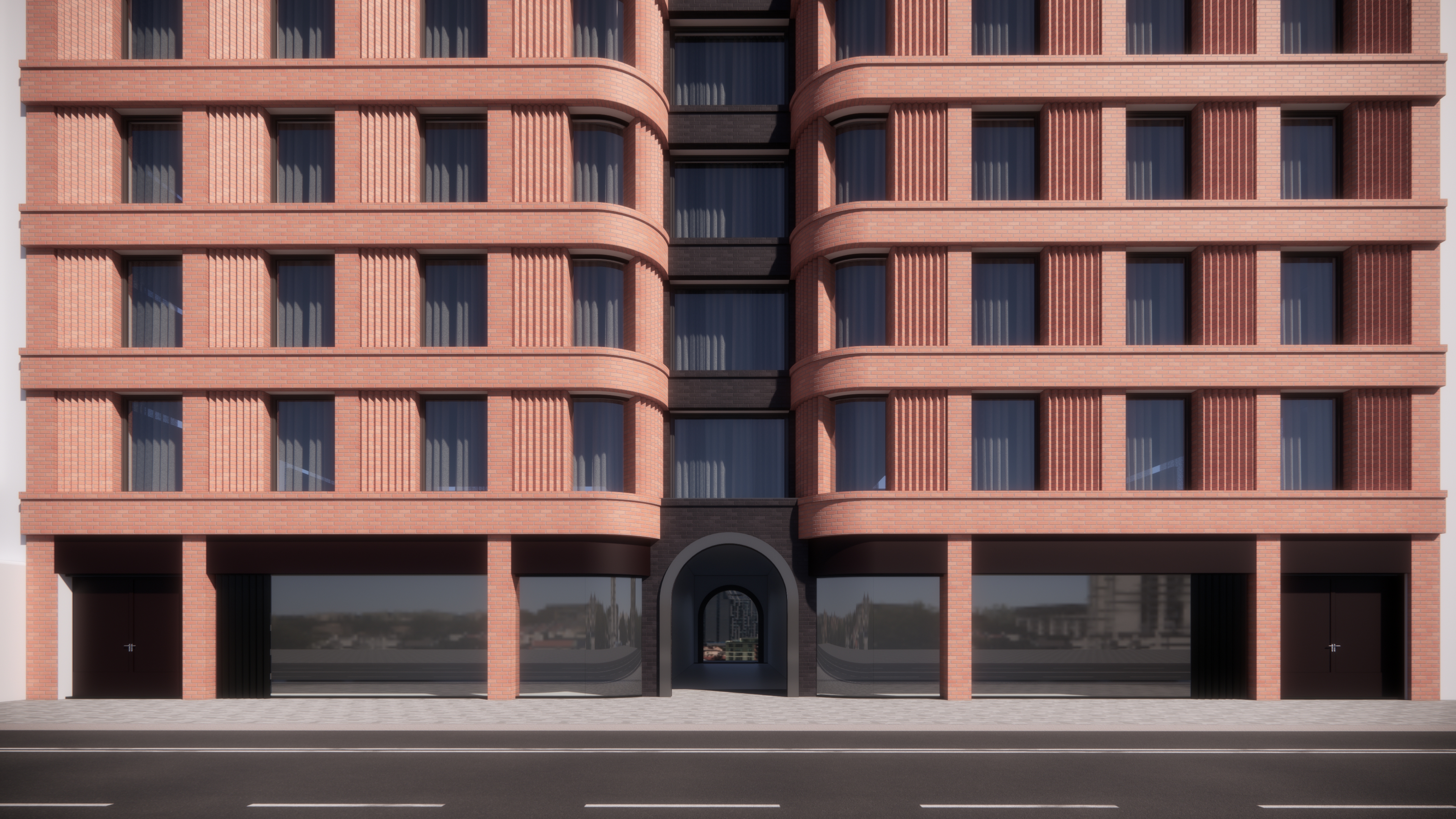 please enhance this image boosted window contrast and reflection street details with pedestrians and subtle improve brick material details upscale the image to hd do not change the geometry please note there is an opening on ground floor that pass through the building till the external on the other side